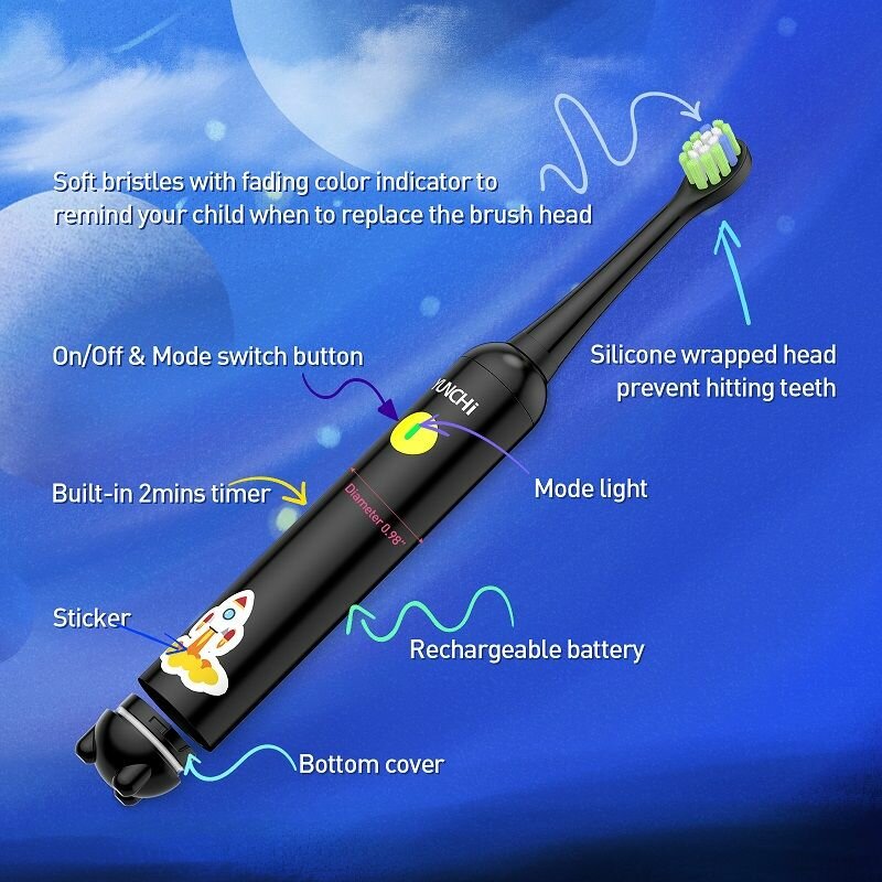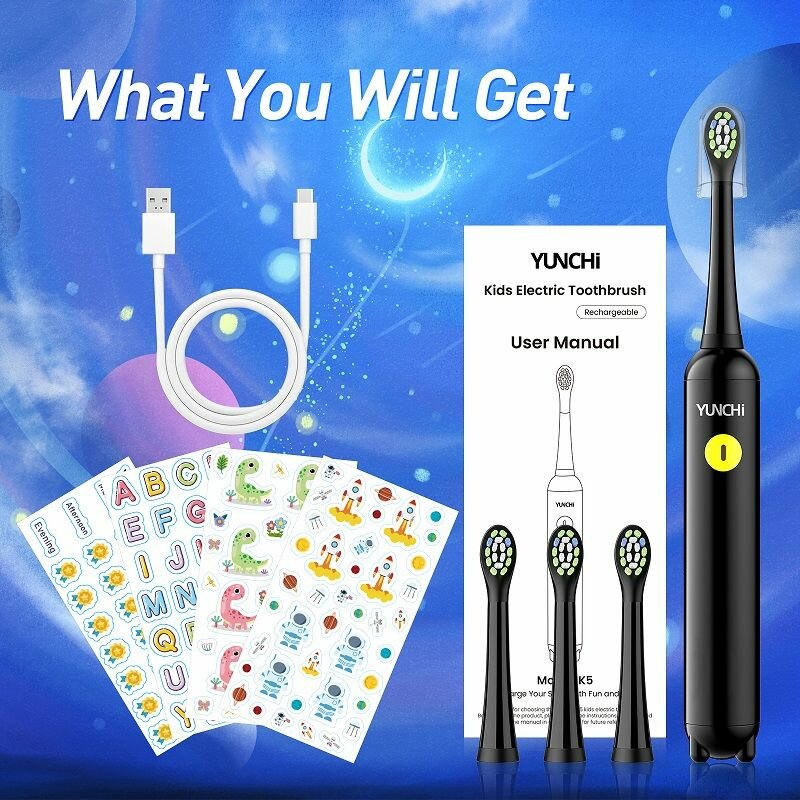 Купить YUNCHI Детская электрическая зубная щетка. 4 шт Головка зубной щетки. Чёрный