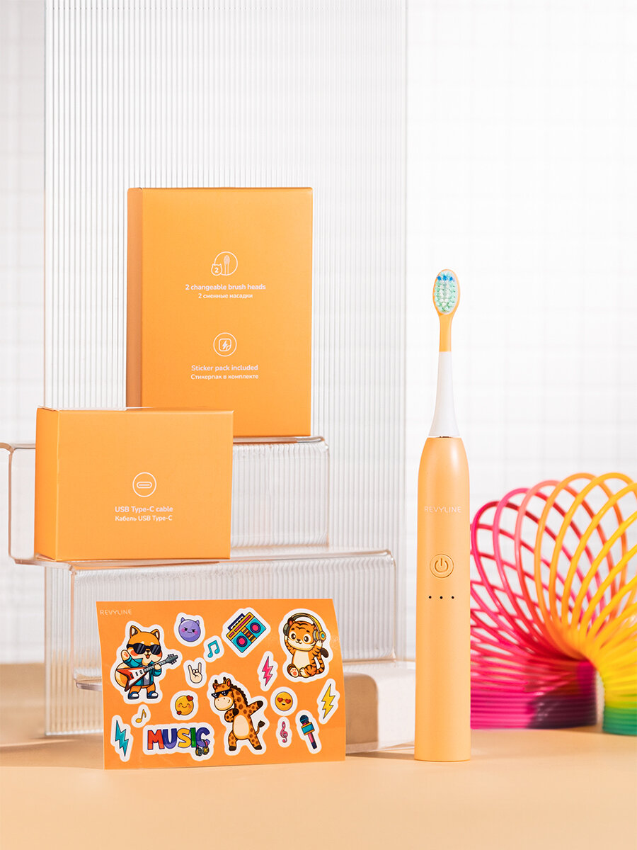 Детская зубная звуковая электрическая щетка Revyline RL 055 Kids, персик, 2 насадки интересное: