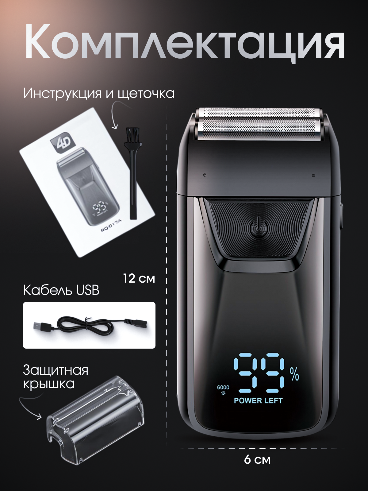 | Подробная комплектация | Электробритва-шейвер 1 штука, щеточка для чистки, кабель, защитная крышка |