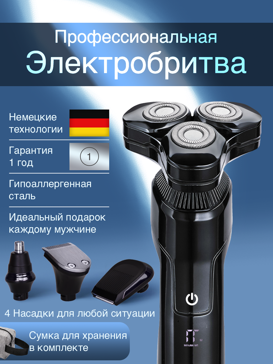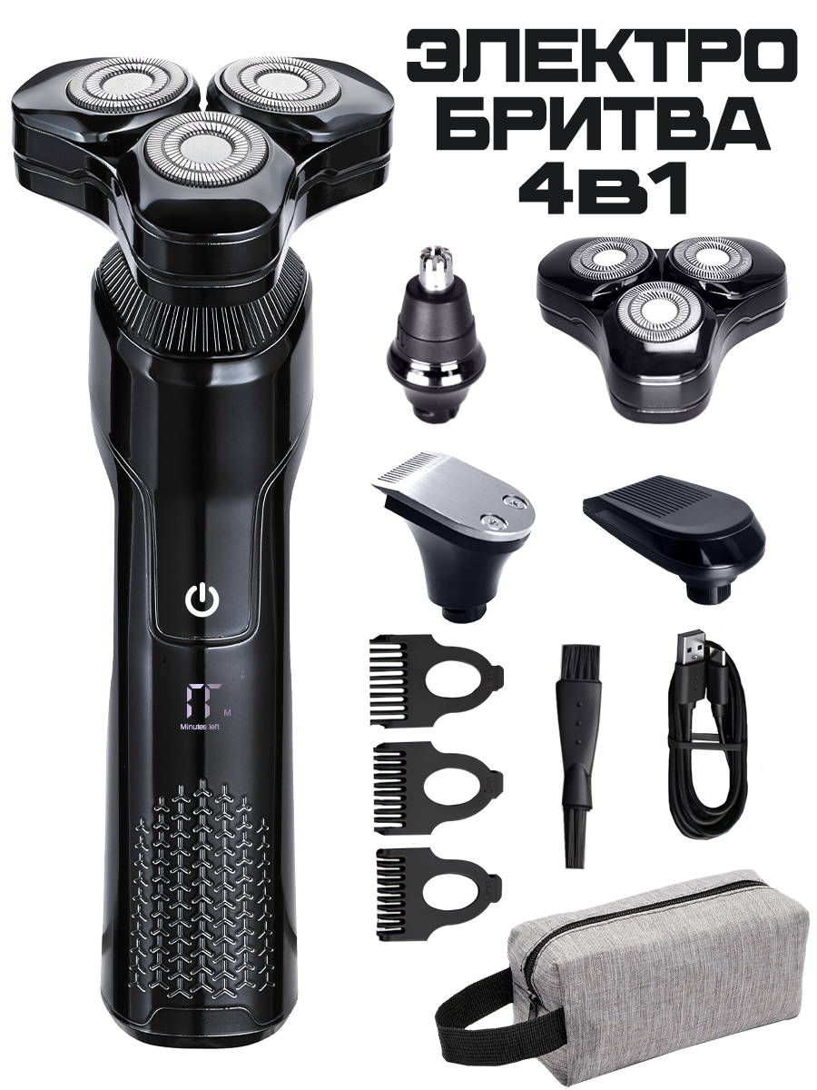 Купить Электробритва мужская беспроводная 4 в1 насадки, триммер, машинка для стрижки, шейвер, влажное бритье, сумка в подарок