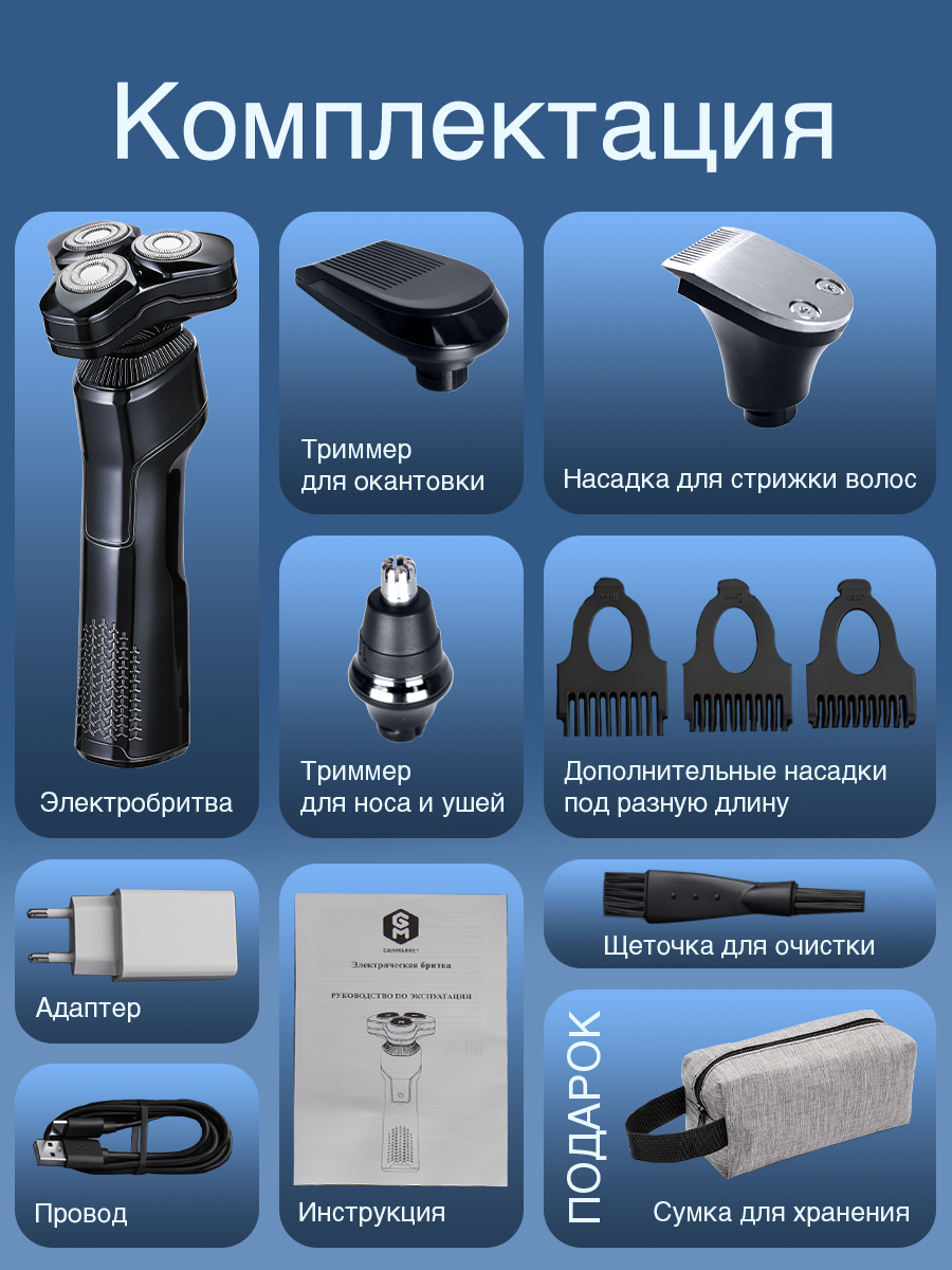 | Подробная комплектация | Бритва, USB-кабель, адаптер, блок подставка, дорожный чехол сумка для хранения электробритвы, насадки для бороды и волос, триммер для носа и ушей, насадка для окантовки прически |