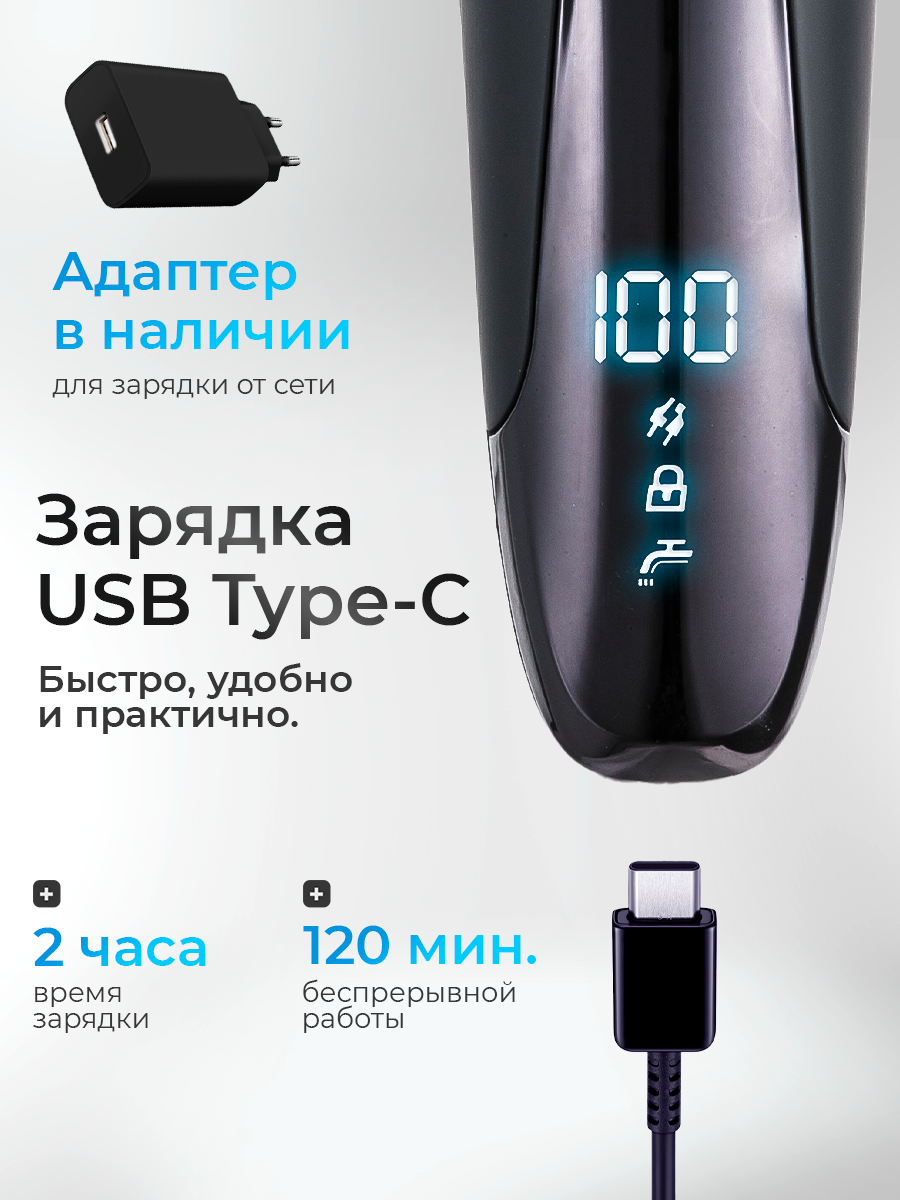 | Особенности | быстрая зарядка / дисплей / для чувствительной кожи / насадка для стрижки волос / питание от USB / триммер |