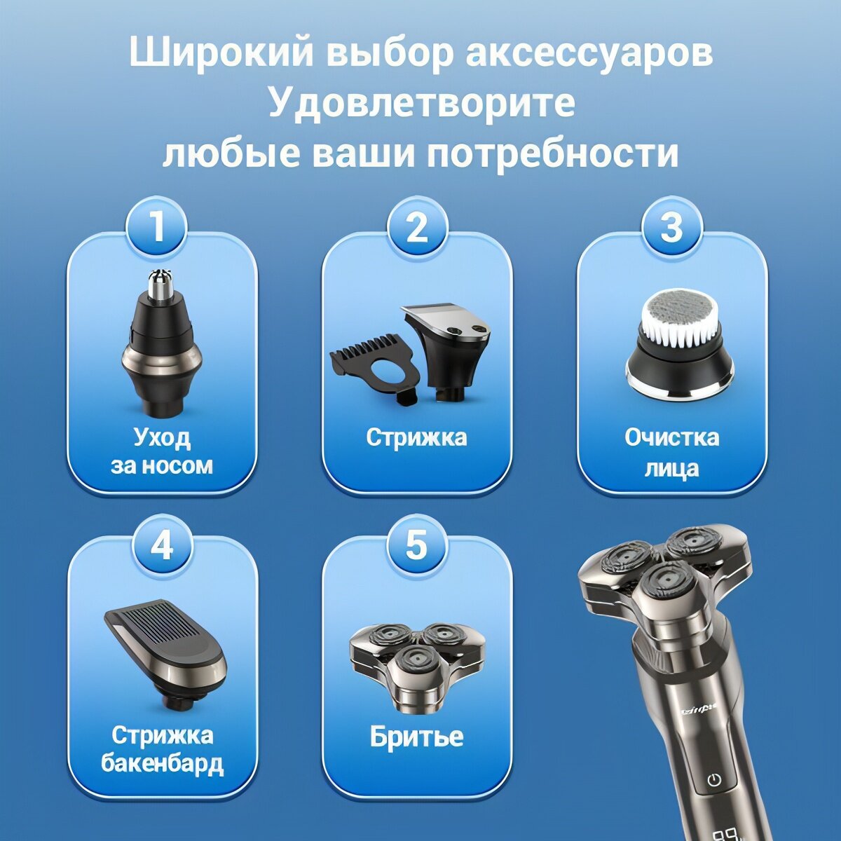 | Дополнительная информация | Промывка ножей под водой; Повторение контуров лица; Насадок - 5 шт. |