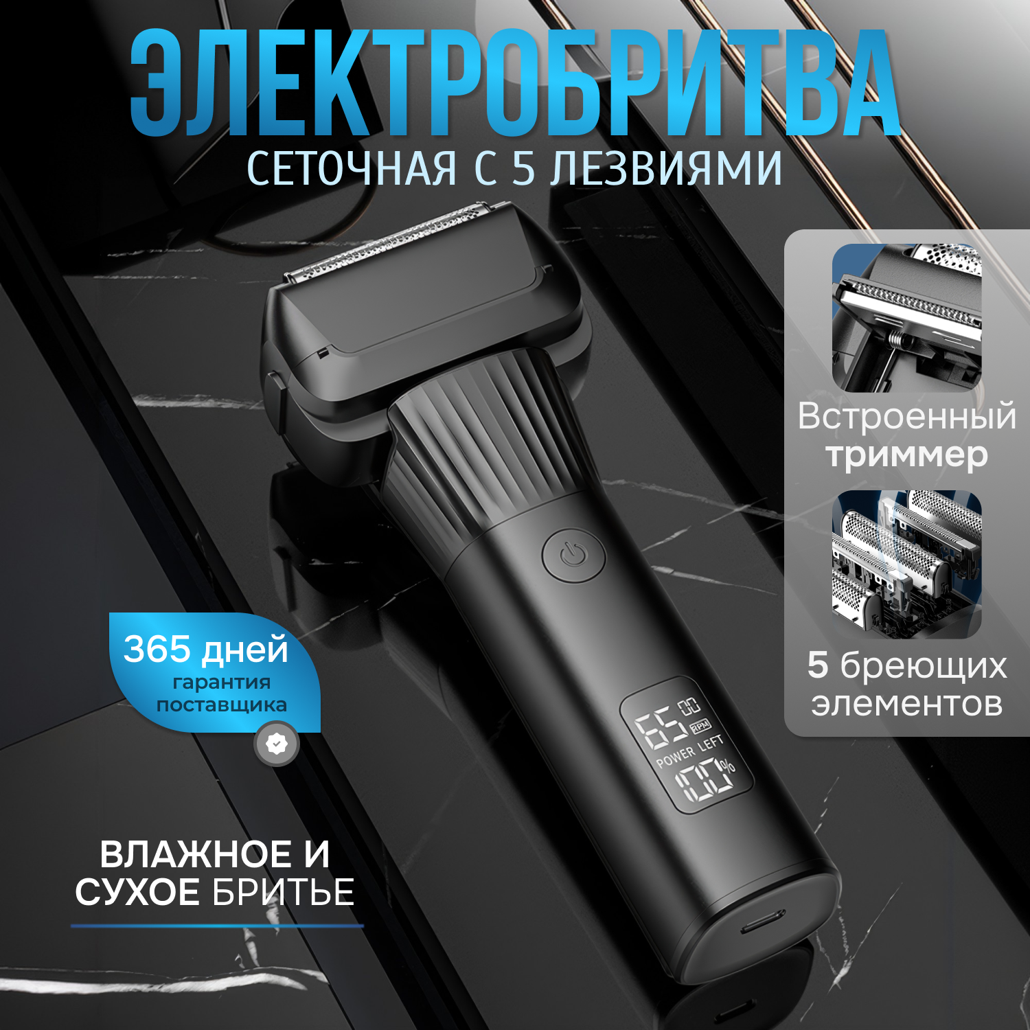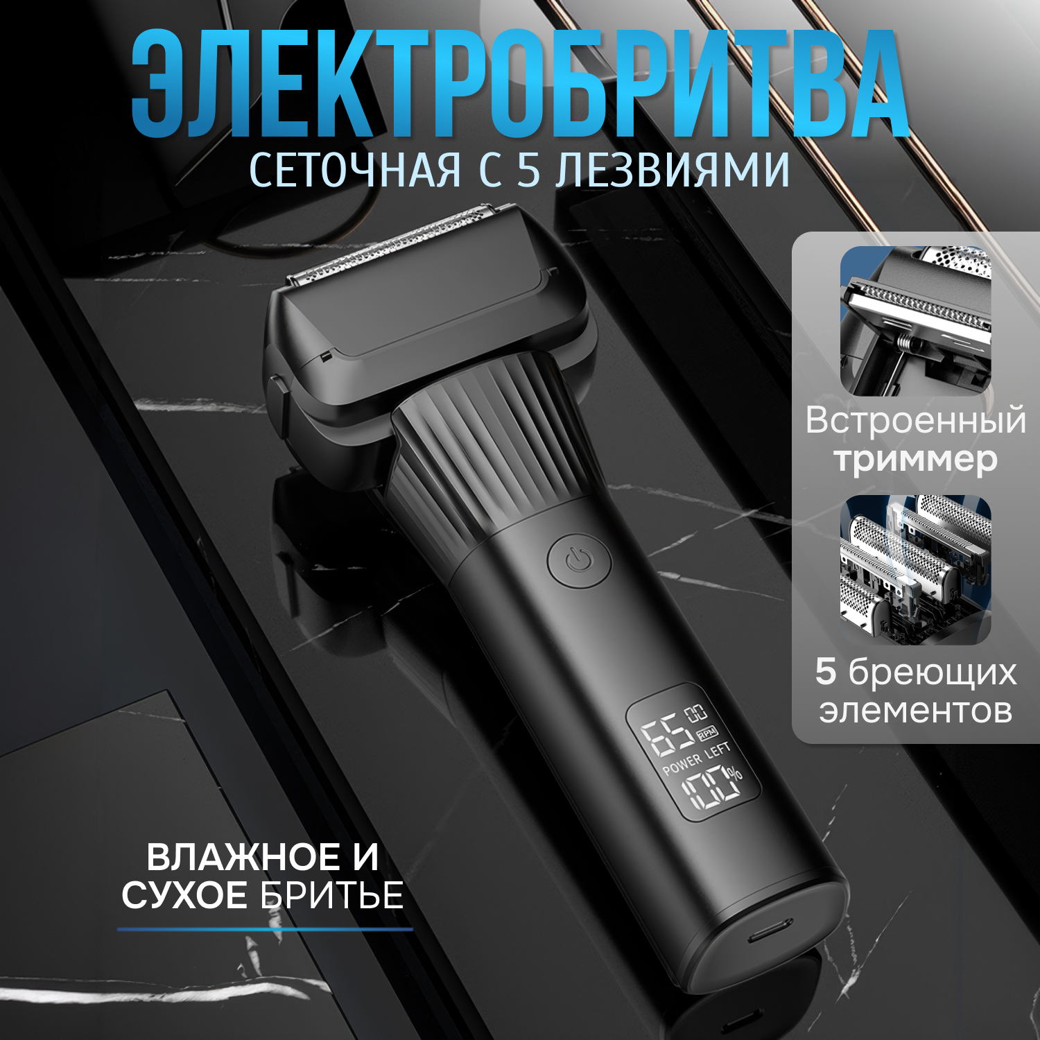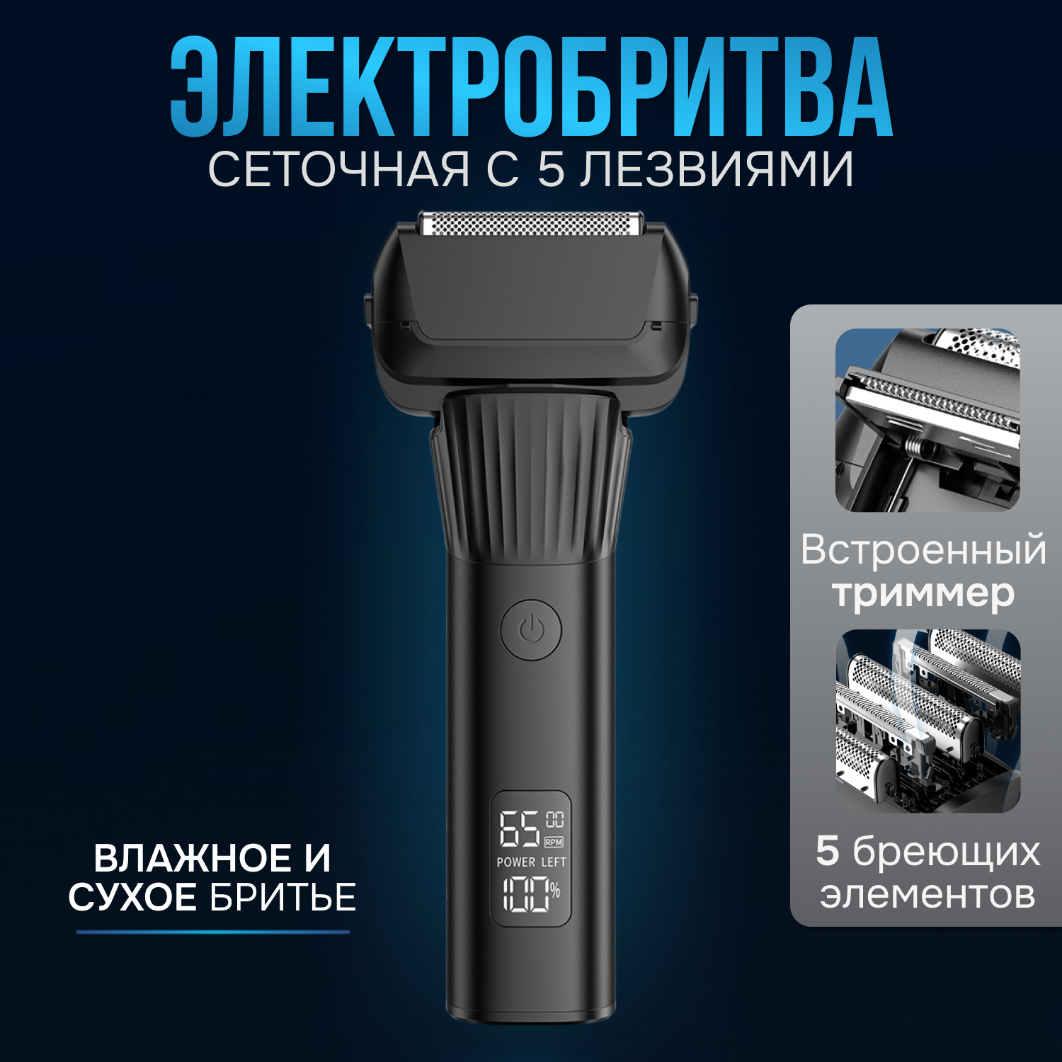 Электробритва мужская для лица беспроводная, встроенный триммер, сухое и влажное бритье интересное: