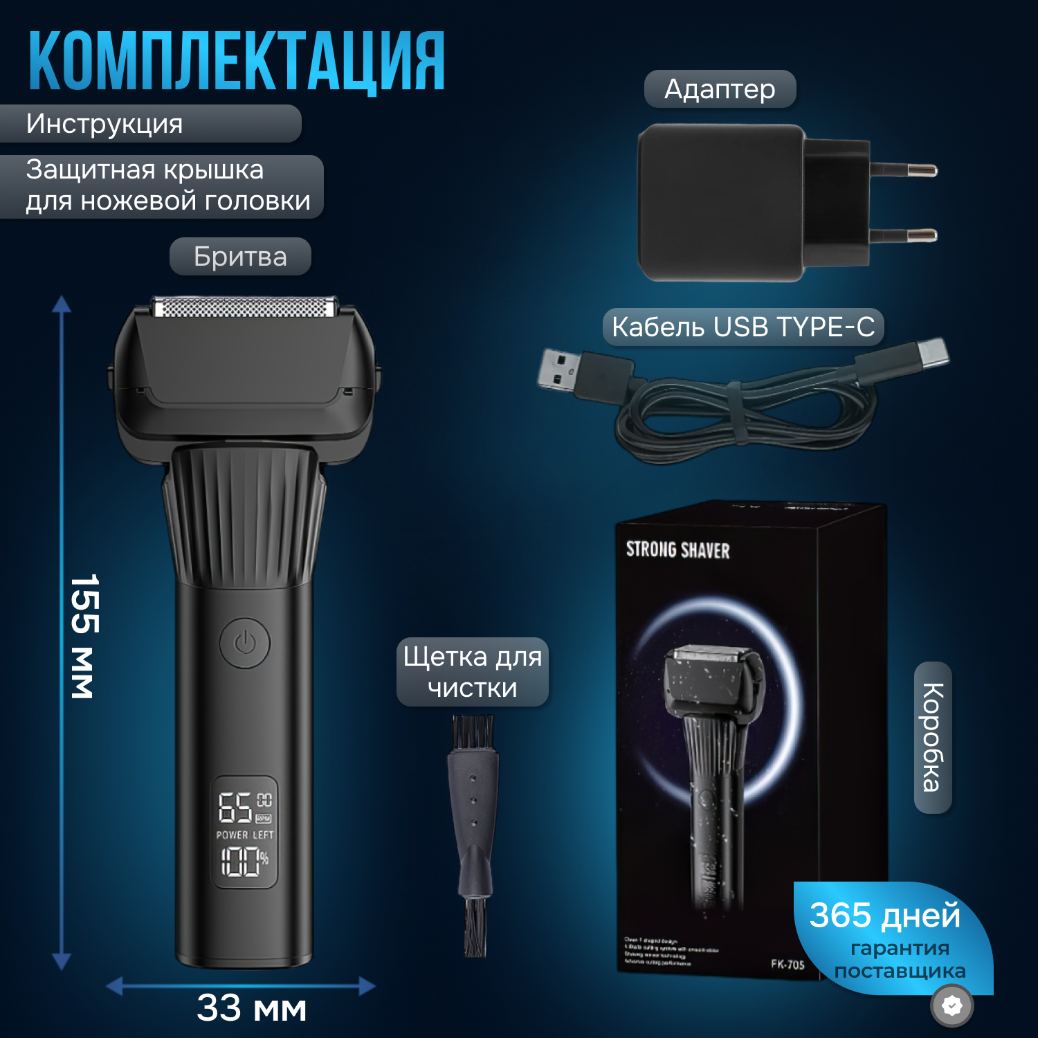| Подробная комплектация | электробритва сетчатая мужская, щеточка для чистки, адаптер, кабель USB, коробка |