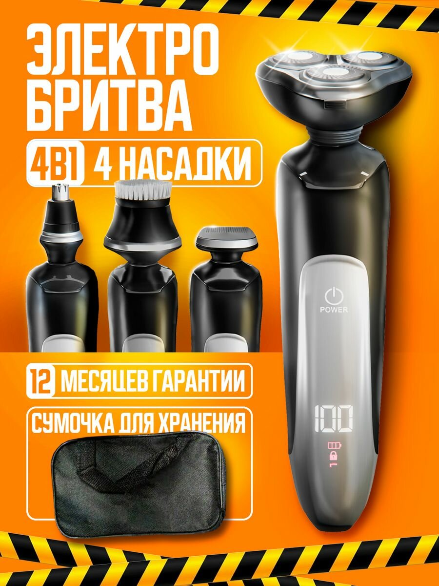 Электробритва мужская для лица 4 в 1 беспроводная с насадками, триммер, машинка для стрижки волос, шейвер сумка подарок интересное: