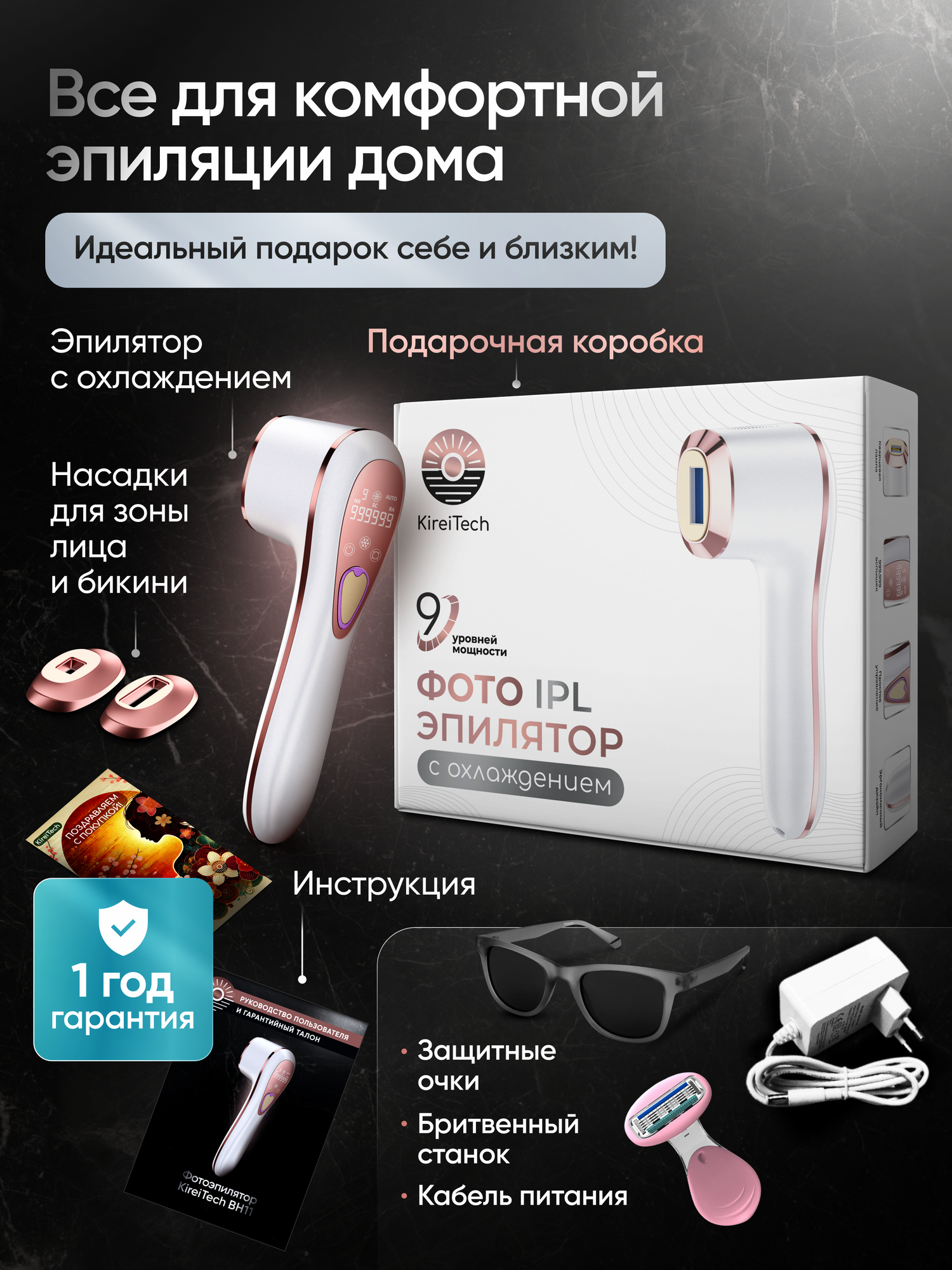 | Подробная комплектация | эпилятор с охлаждением, 2 насадки для зоны лица и бикини, кабель питания, одноразова бритва, защитные очки, цветная русскоязычная инструкция, подарочная магнитная коробка, гофорокартоновая коробка |