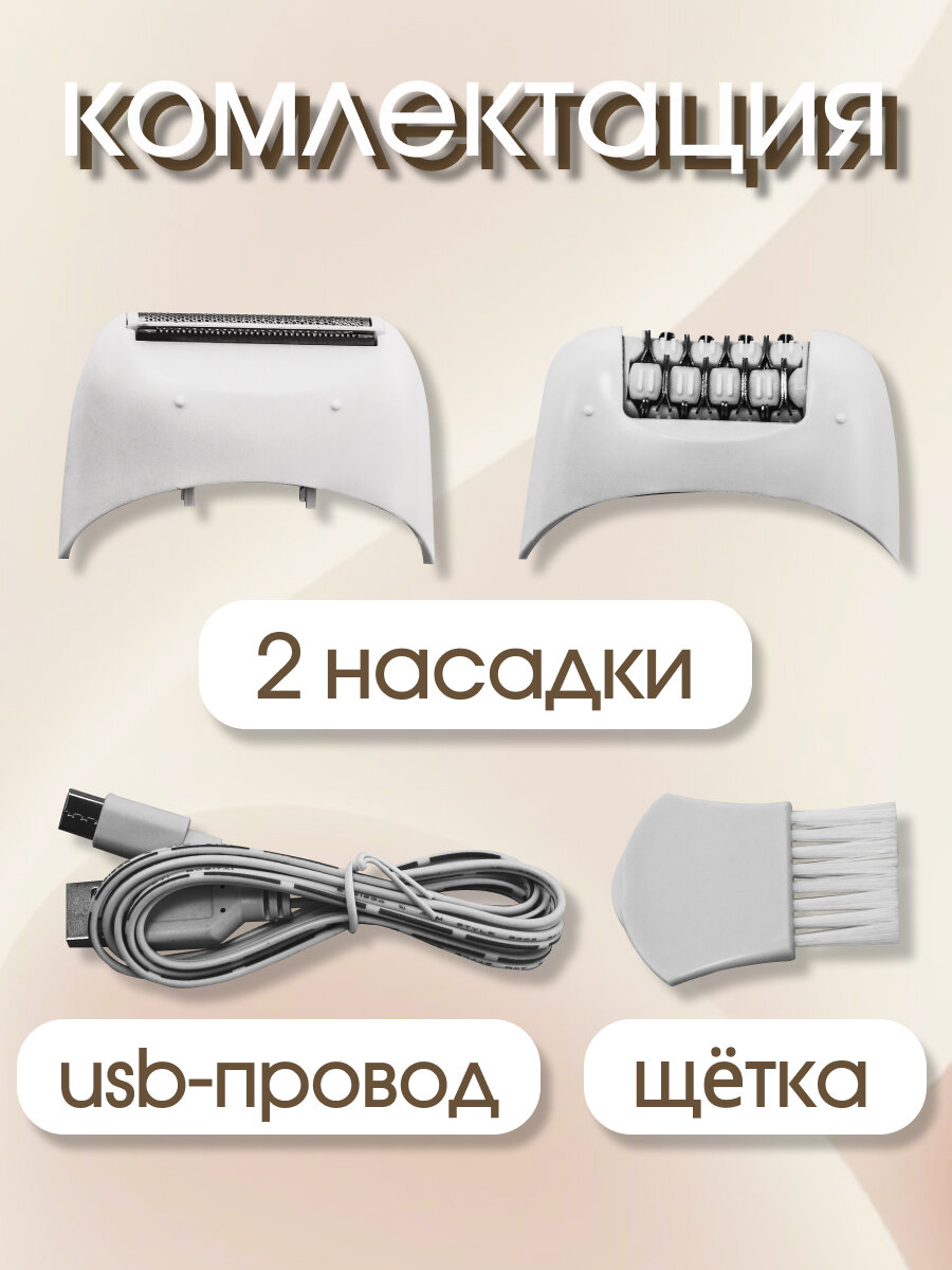 | Подробная комплектация | 2 насадки , эпилятор, щетка, кабель usb |