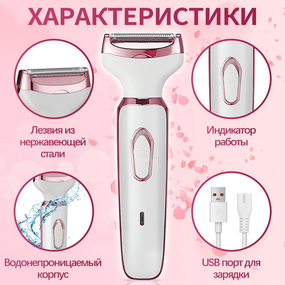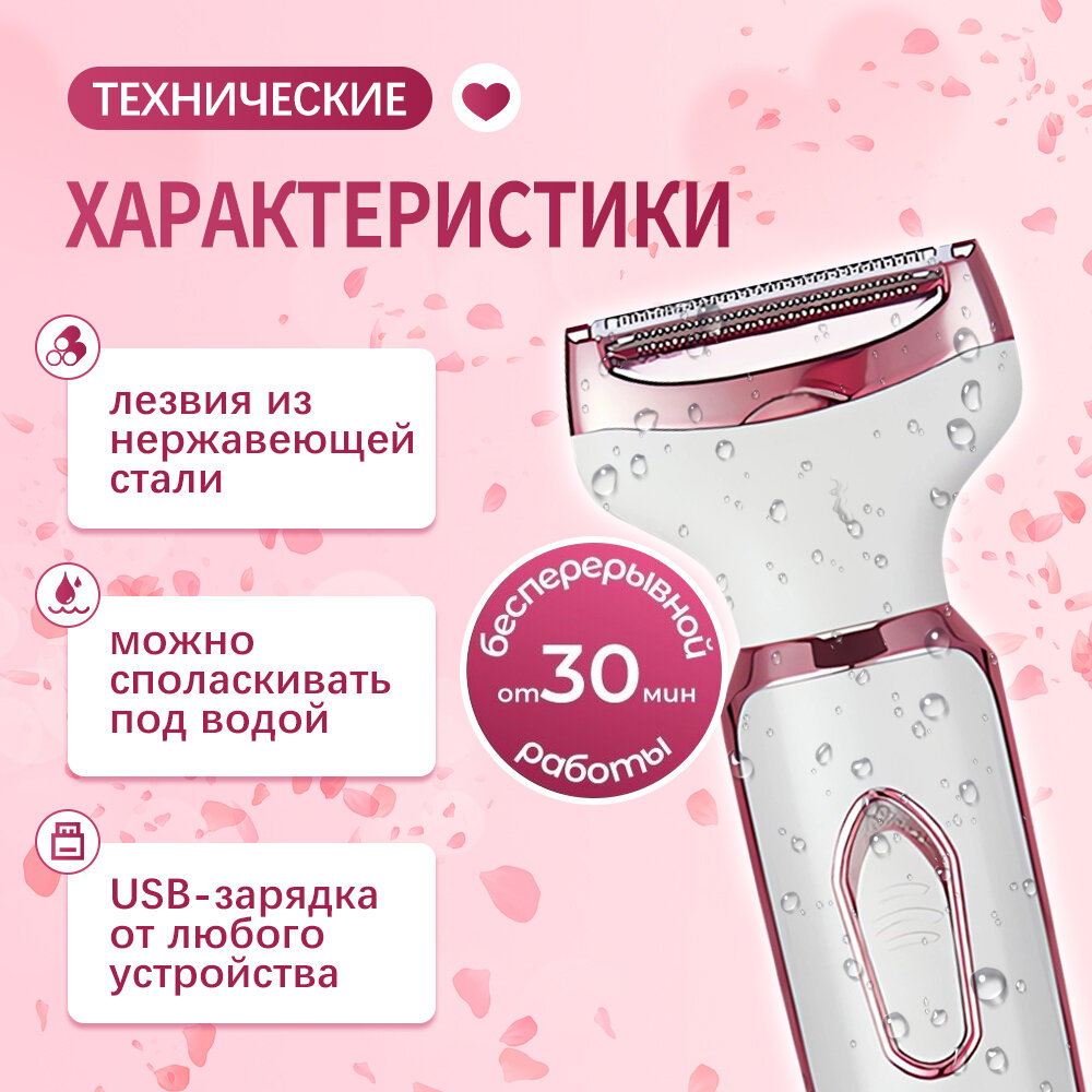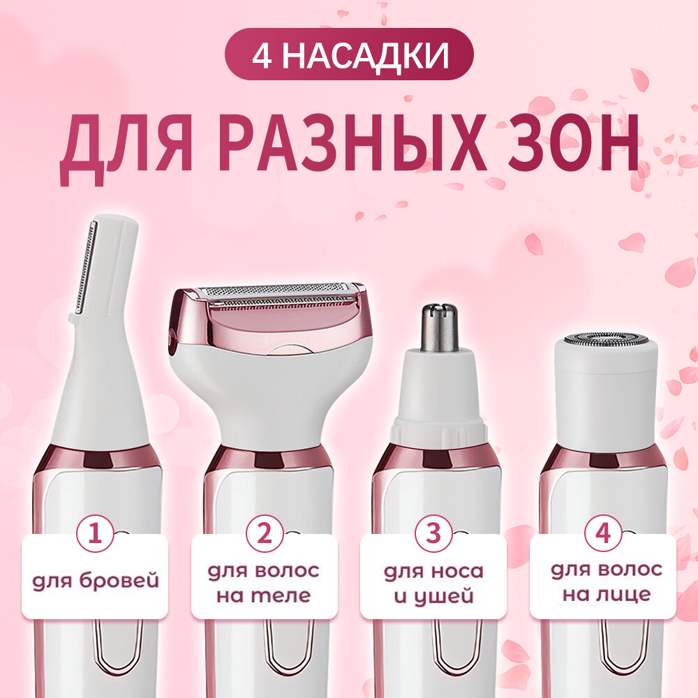Эпилятор-бритва с насадками, для бикини, лица, подмышек, тела, питание от акк, белый/розовый интересное: