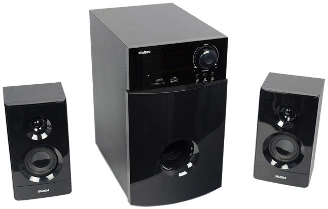 Колонки Sven MS-2100 2.1, мощность (RMS): 50Вт + 2х15Вт, SD/USB, FM-радио, VFD-дисплей, пульт ДУ