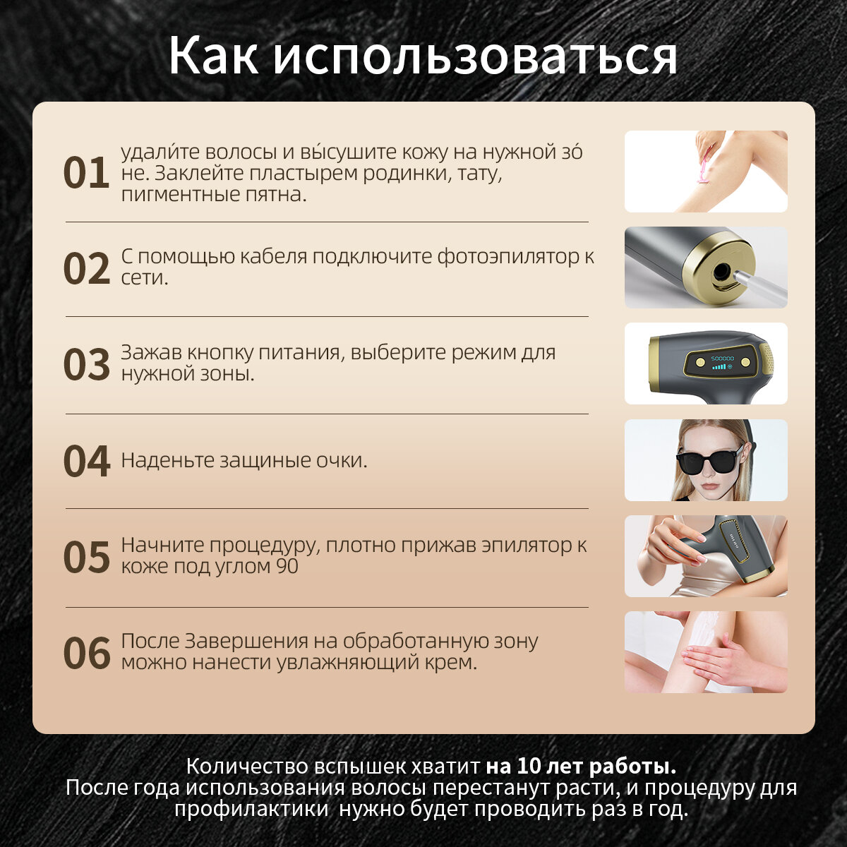 | Дополнительная информация | охлаждающий эффект; автоматический режим удаление волос; омоложение кожи |