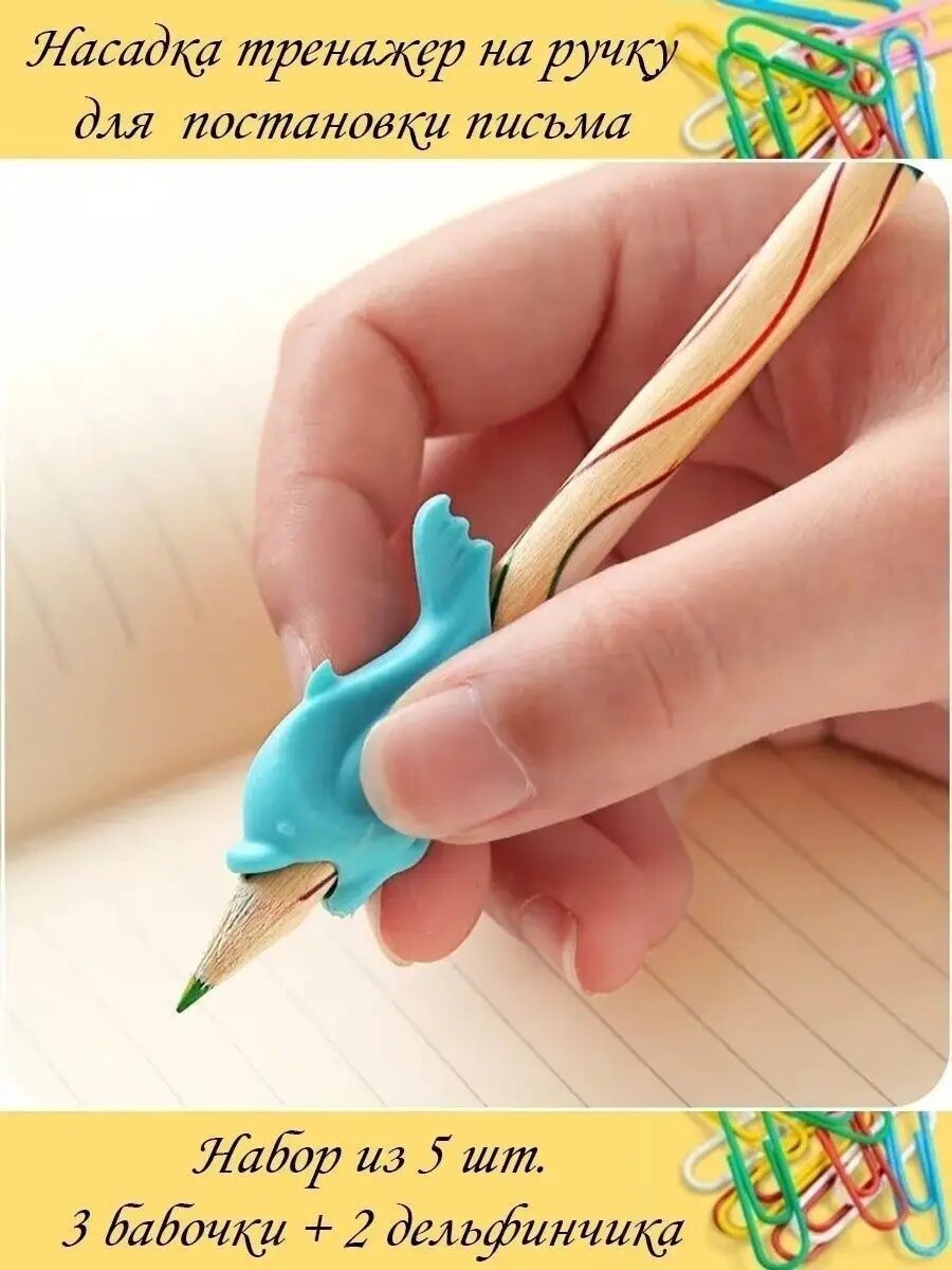 | Подробная комплектация | В наборе 5 насадок-тренажеров на ручку и карандаш в виде рыбок-дельфинчиков. |