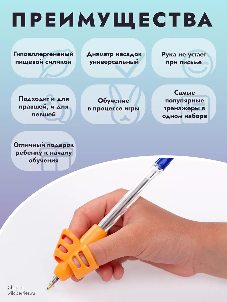 СохранитьТренажер для письма Chipico, для ручек и карандашей, разноцветные, силикон, 5 насадок интересное: