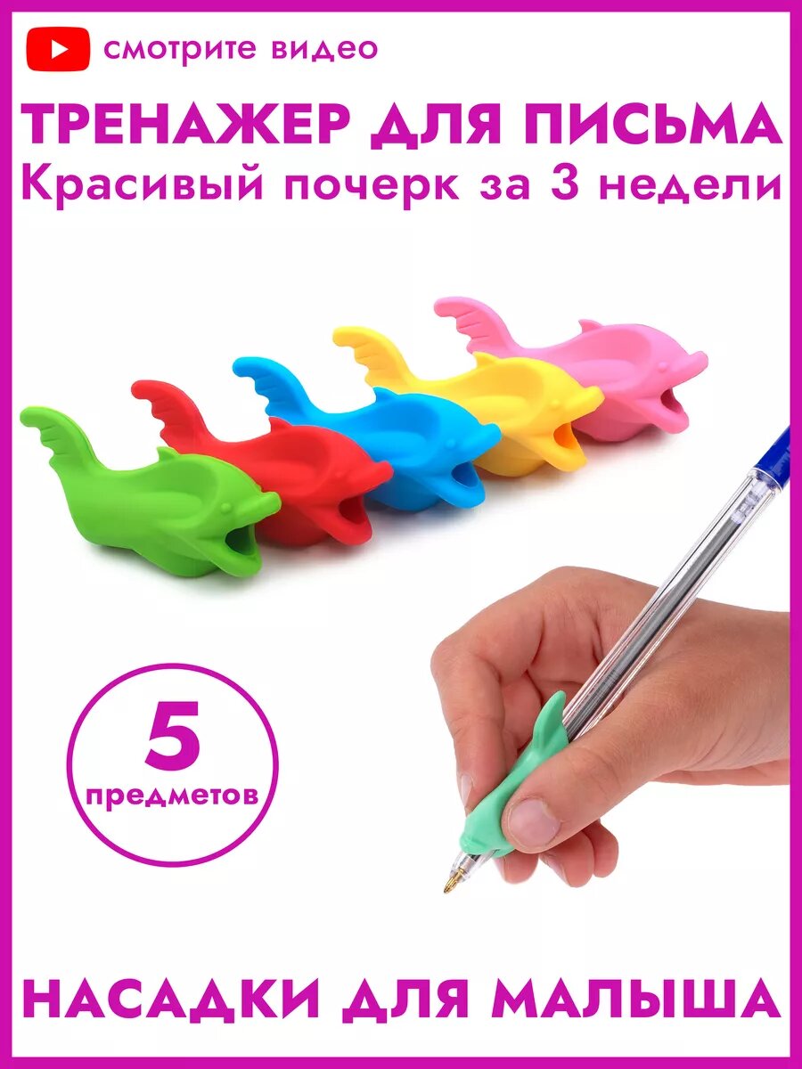 | Подробная комплектация | В наборе 5 насадок-тренажеров на ручку и карандаш в виде рыбок-дельфинчиков. |
