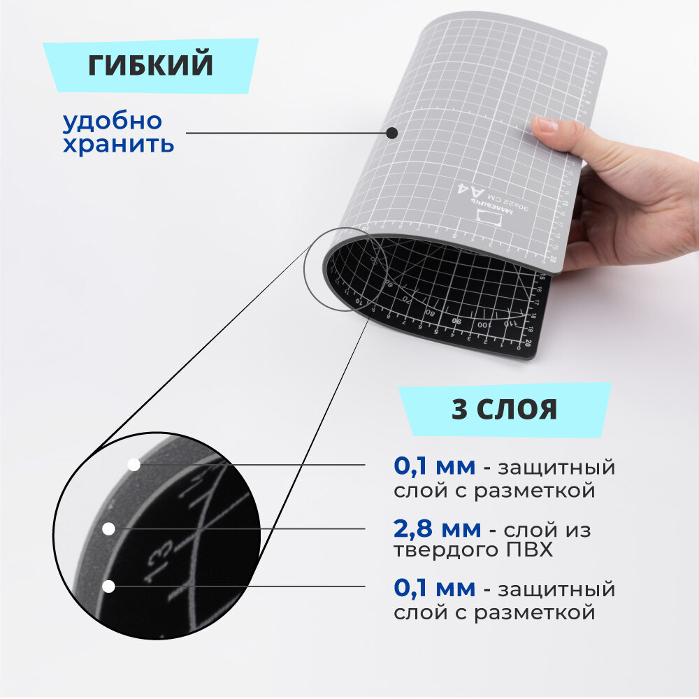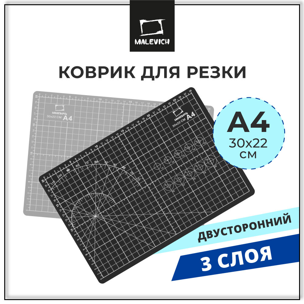 Коврик для резки Малевичъ, самовосстанавливающийся, А4, 3-слойный, черно-серый интересное: