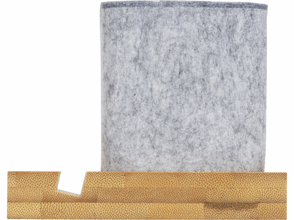 | Подробная комплектация | фетровый стакан 7 х 7 х 8,3 см, подставка из бамбука 8,4 х 11,7 х 1,9 см, крафт- коробка с полтграфией |