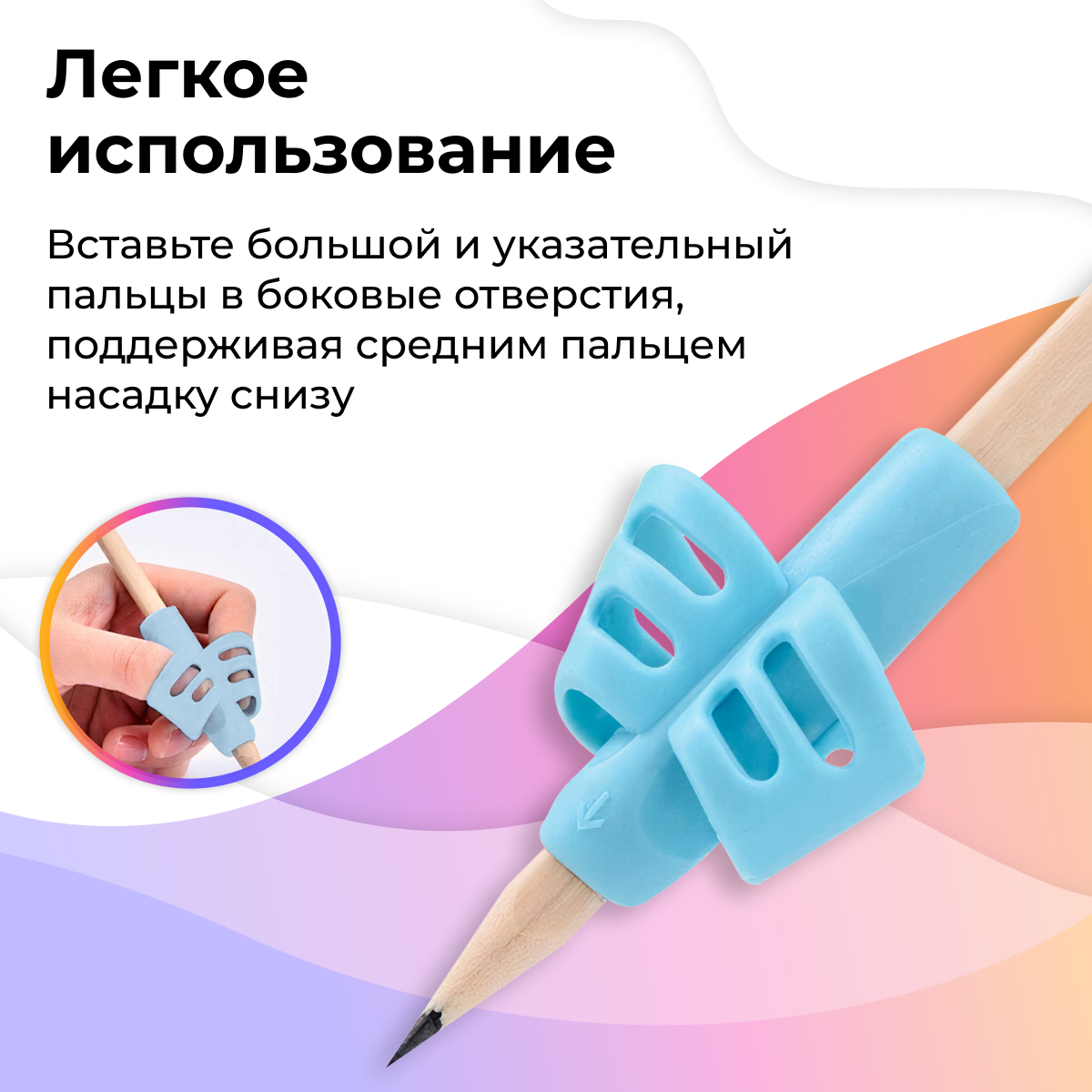 | Дополнительная информация | Как использовать? Вставьте большой и указательный пальцы в отверстия. Улыбнитесь Приступайте к письму. Тренажер подходит как для левшей, так и для правшей! На какие принадлежности можно установить? Устанавливается на все типы принадлежностей: шариковые, капиллярные и гелевые ручки; карандаши; маркеры; фломастеры; мелки; изготовлен из пищевого силикона ААА-класса |