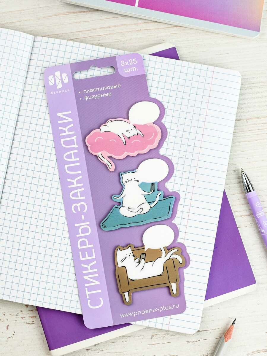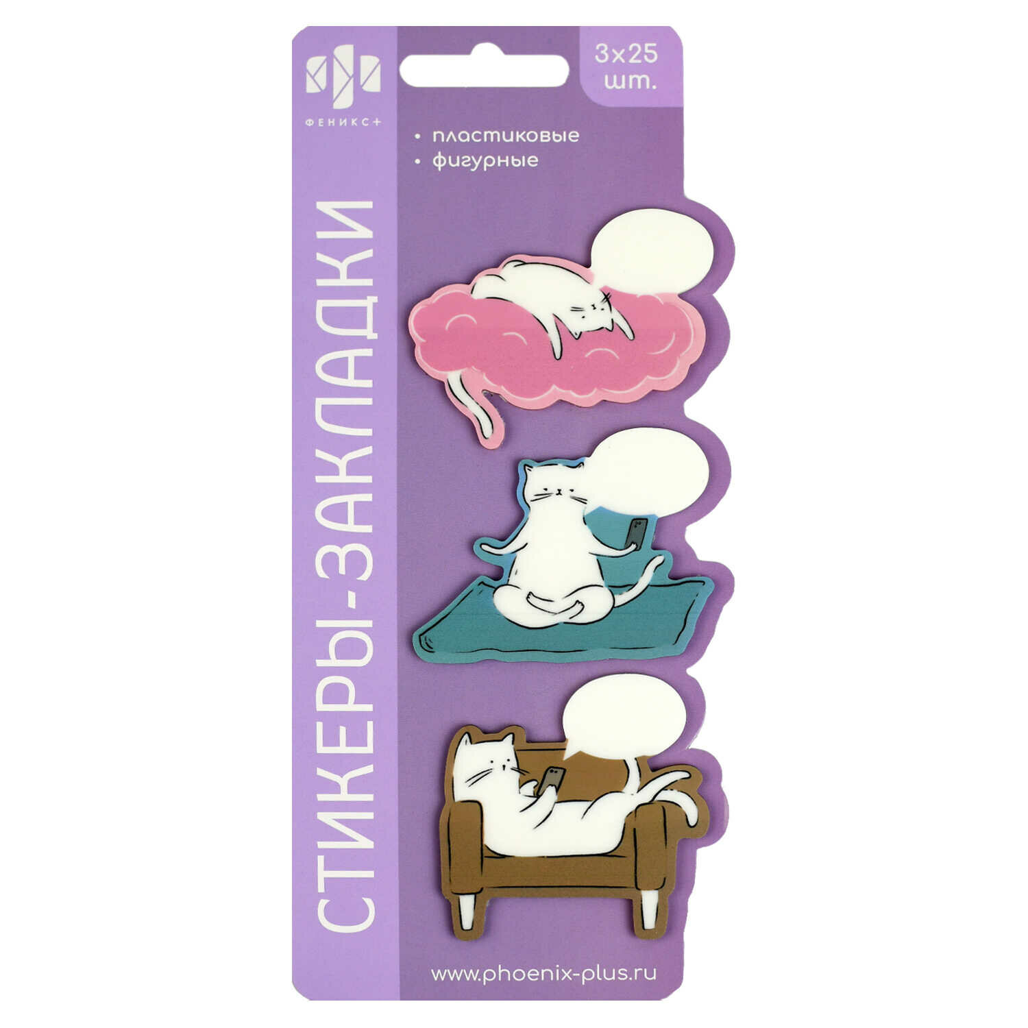 Стикеры-закладки пластиковые, "КОТЫ", размер 59х48; 58х47; 52х54 мм, 3 цвета, 75 шт. в наборе интересное: