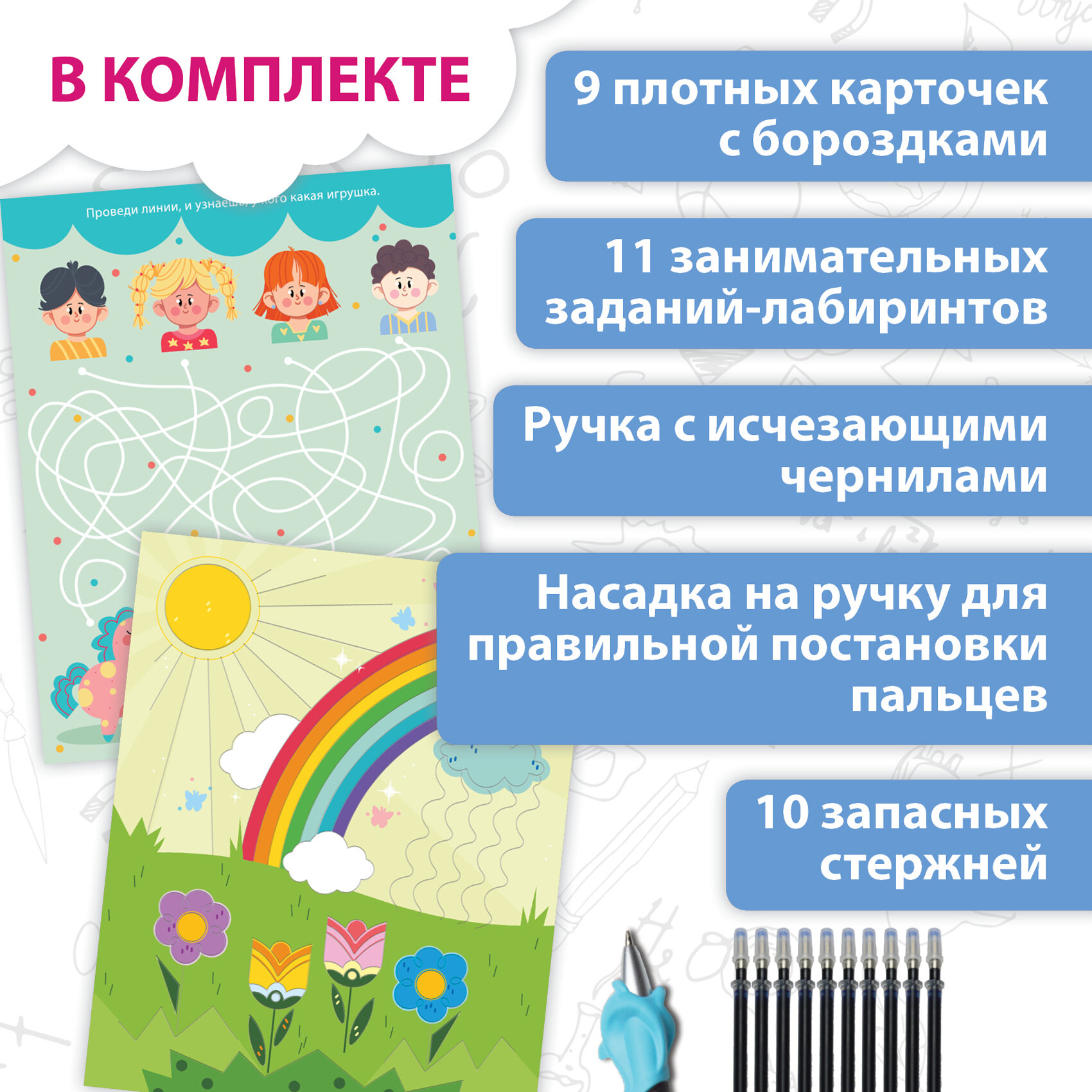 | Подробная комплектация | 9 карточек с тиснением, ручка, 10 запасных стержней, насадка на ручку |