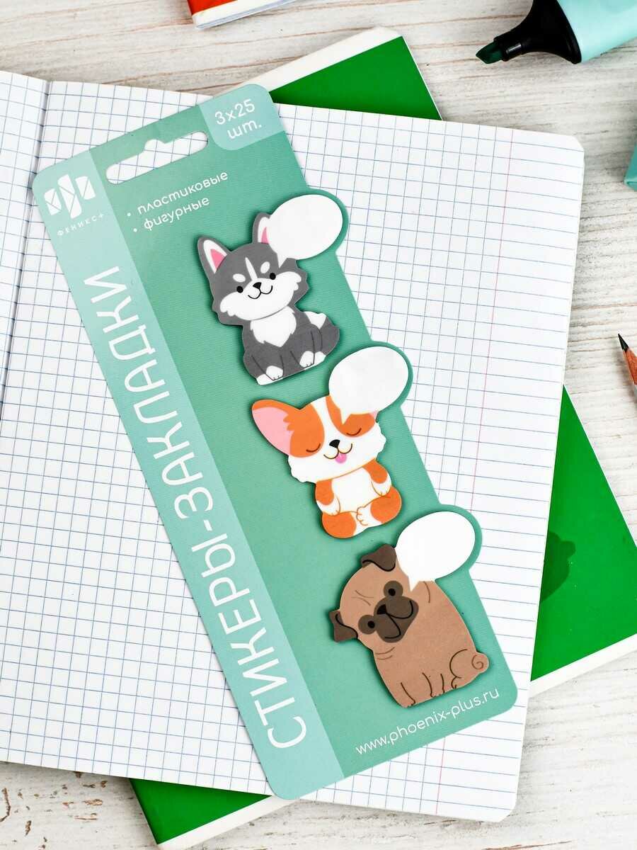 Стикеры-закладки пластиковые, "ПСЫ", размер 46х48; 47х49; 49х49 мм, 3 цвета, 75 шт. в наборе интересное: