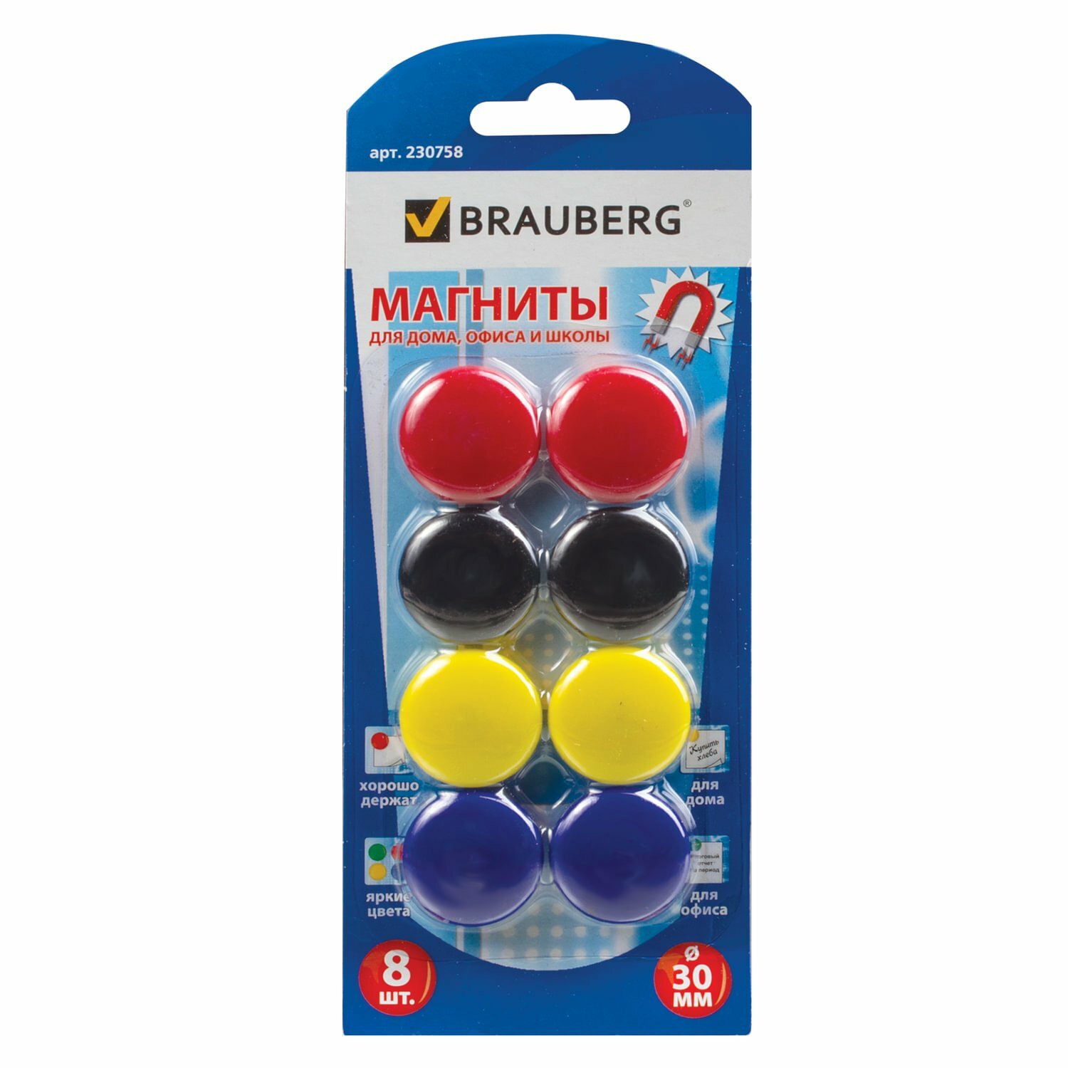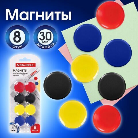 Магниты диаметром 30 мм, комплект 8 штук, цвет ассорти, в блистере, BRAUBERG, 230758 Комплект : 1 шт .