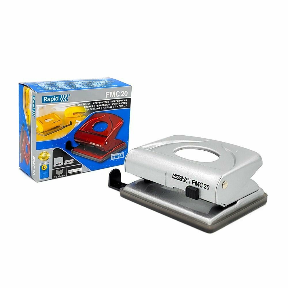 Купить Дырокол средний Rapid FMC20, 20 л, диаметр отверстия 5,5 мм, картонная коробка серебристый, пр-во Швеция
