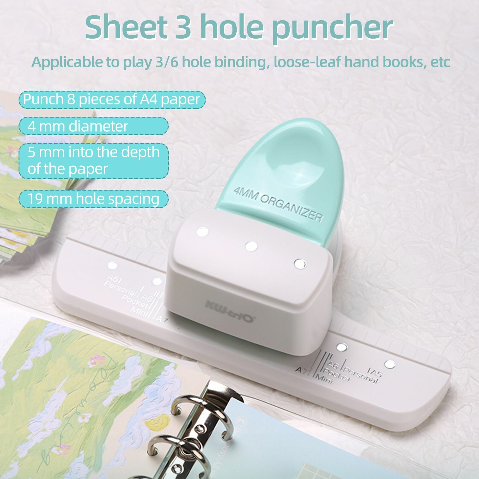 Купить Дырокол, расстояние 19 мм, 3 отверстия, можно напечатать 8 листов бумаги формата А4