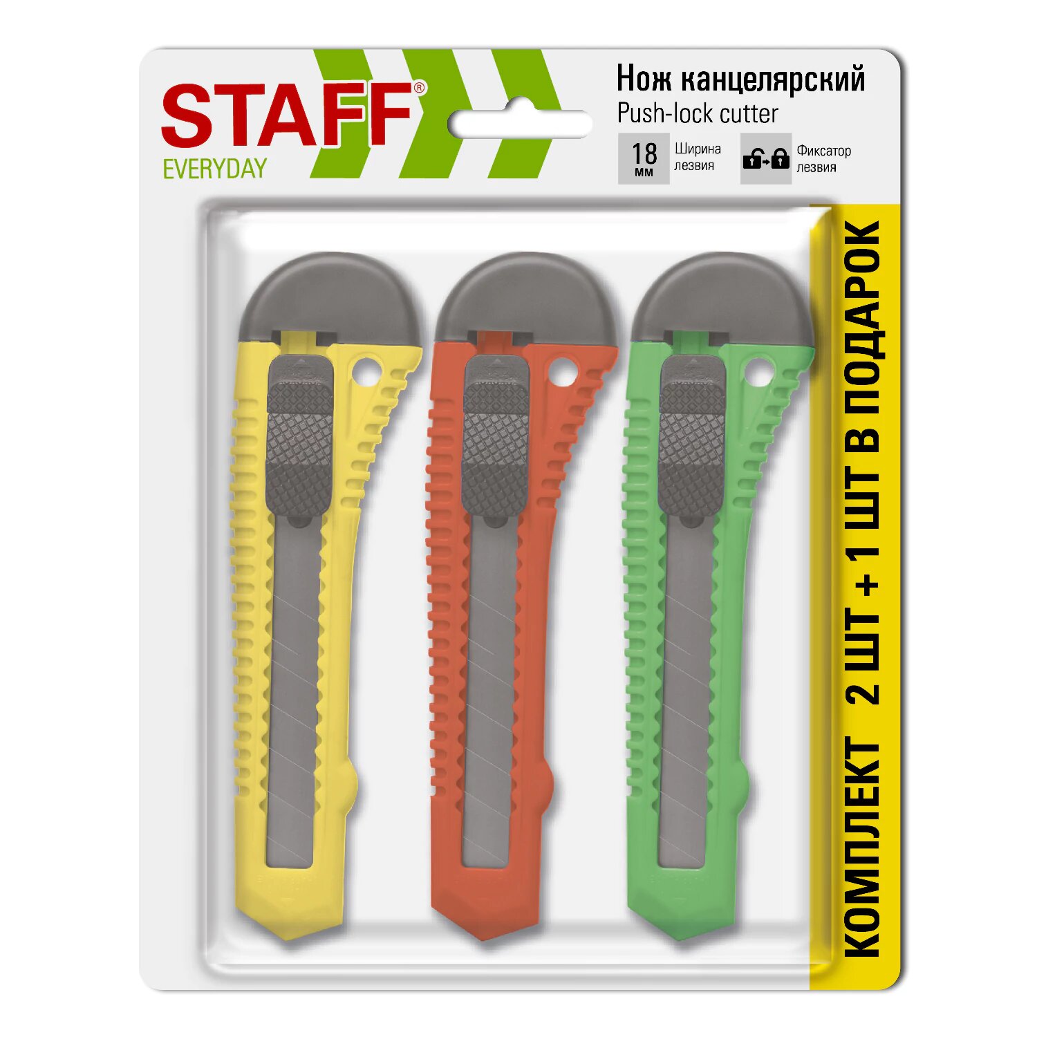 СохранитьНож канцелярский строительный универсальный набор 3 штуки, ширина лезвия 18 мм, фиксатор, Staff Everyday, 238769 интересное: