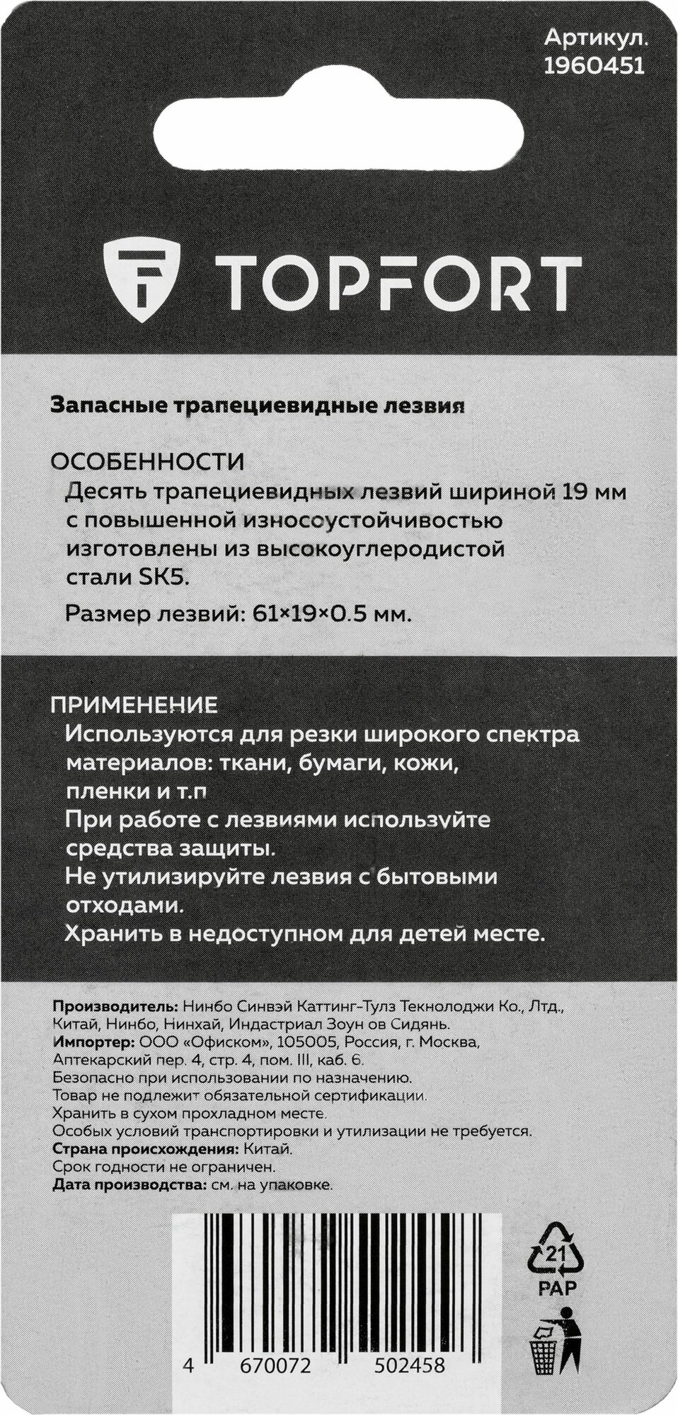 Лезвие сменное TOPFORT сталь, 19 мм, трапециевидное, сталь SK5, 10 шт интересное: