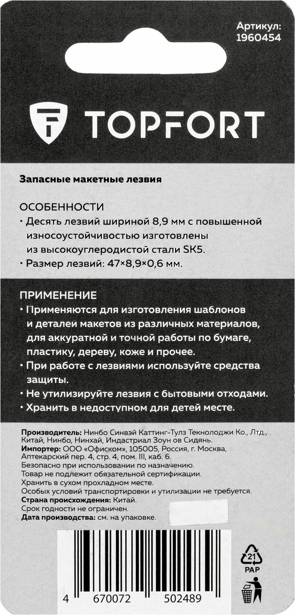 Лезвие сменное TOPFORT сталь SK5, 8.9 мм, специальное, 10 шт интересное: