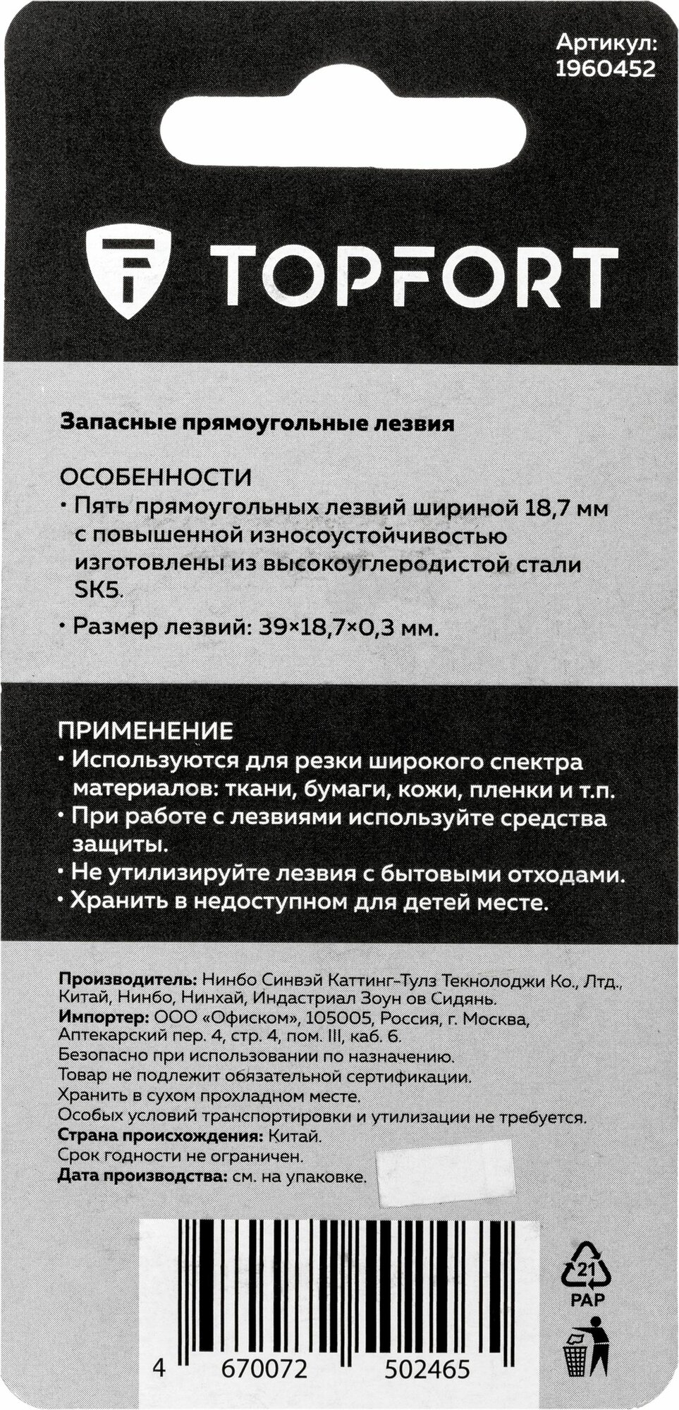 Купить Лезвия для канцелярского ножа TOPFORT, прямоугольные, 18.7 мм, 5 штук в упаковке