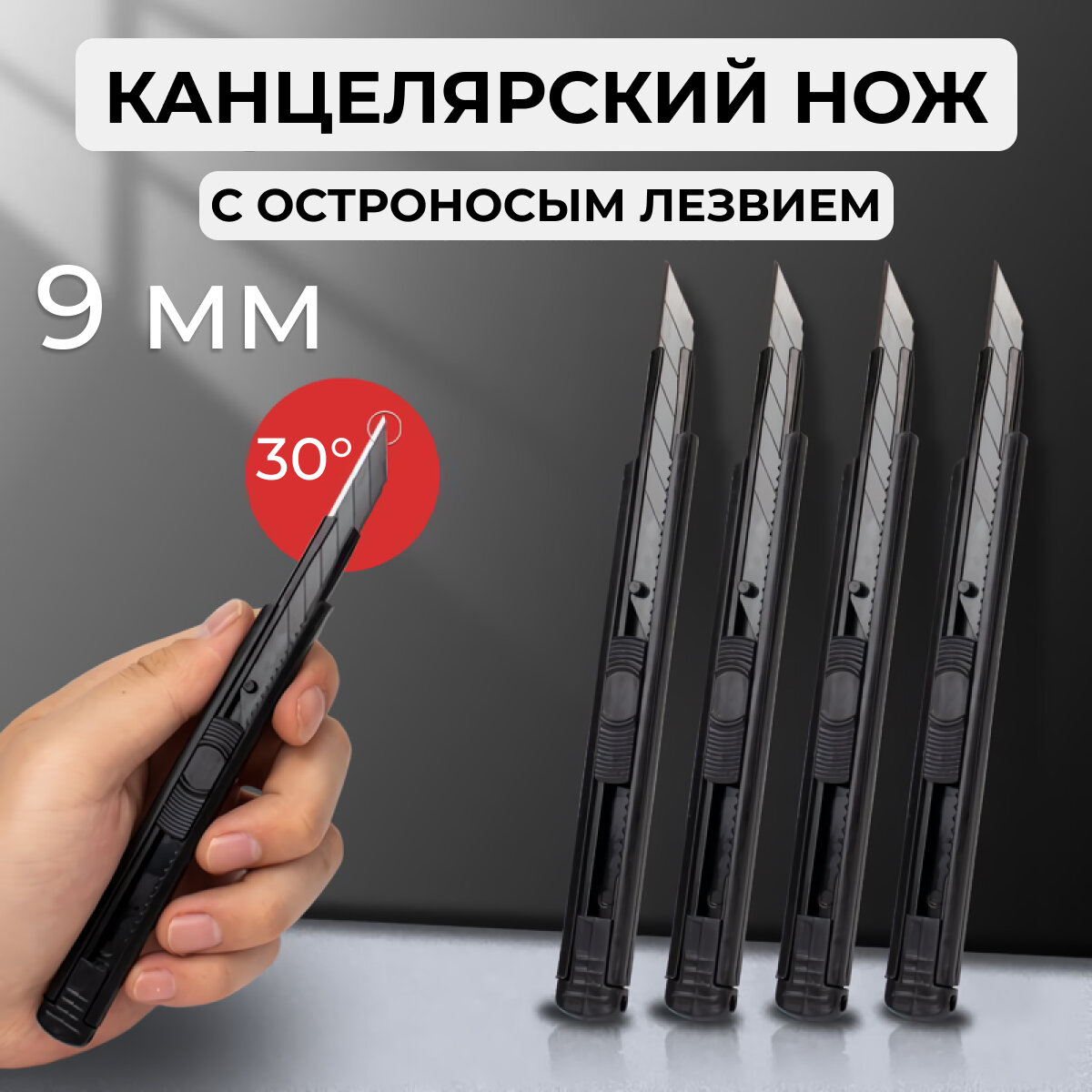 Канцелярский нож, выдвижное лезвие, блокировка лезвия, черный лезвия 9 мм угол 30 градусов интересное: