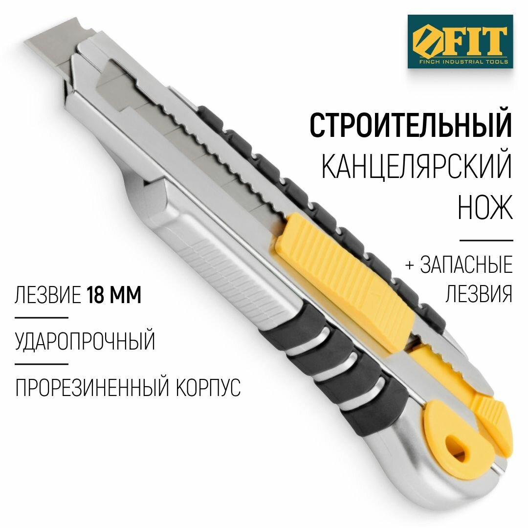 FIT Канцелярский нож строительный с запасными сегментированными лезвиями 18 мм, усиленный прорезиненный