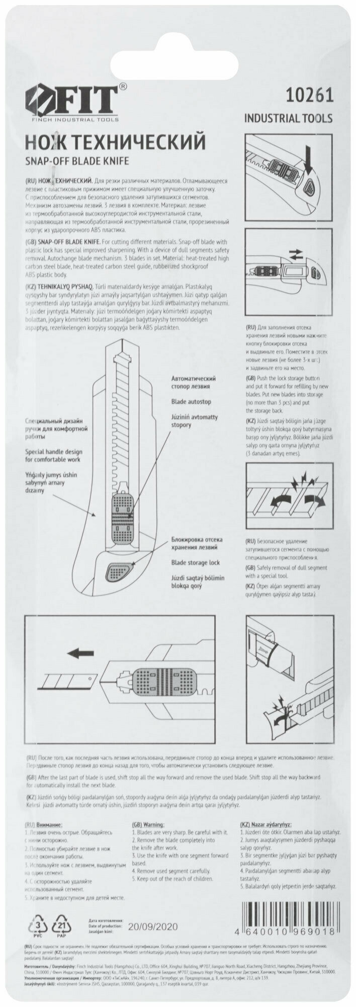 FIT Канцелярский нож строительный, сегментированное лезвие 18 мм усиленный прорезиненный
