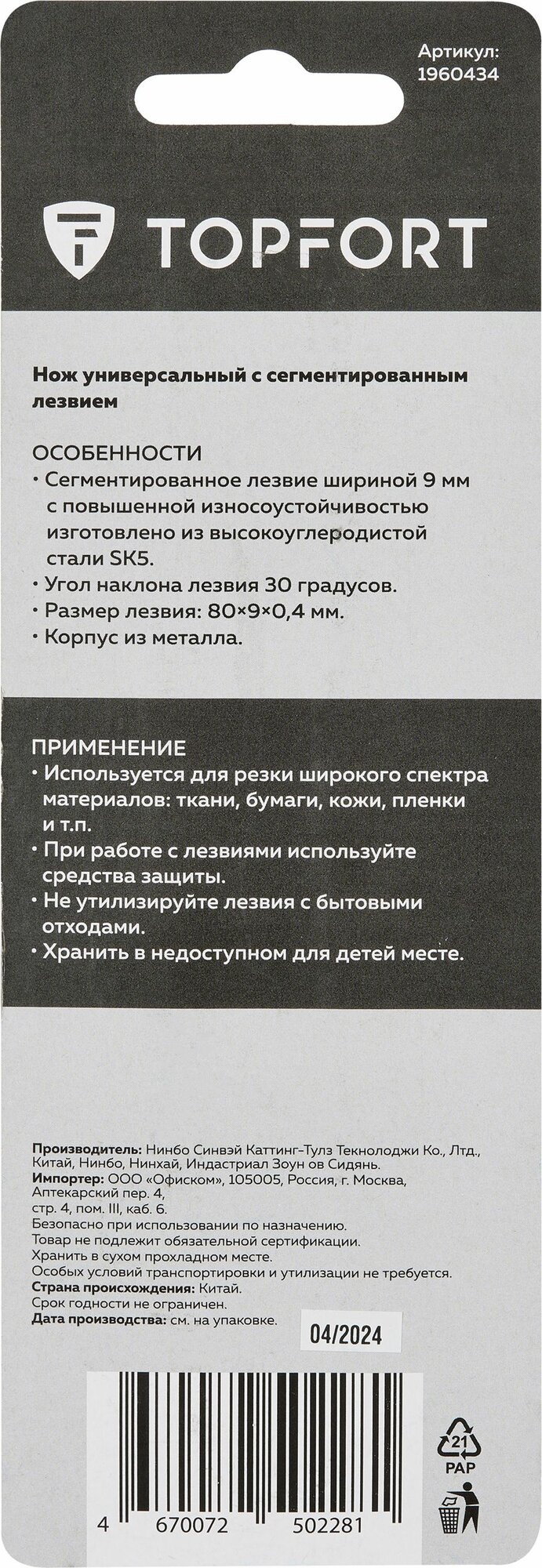 Нож универсальный, TOPFORT, ширина лезвия 9 мм, с фиксатором