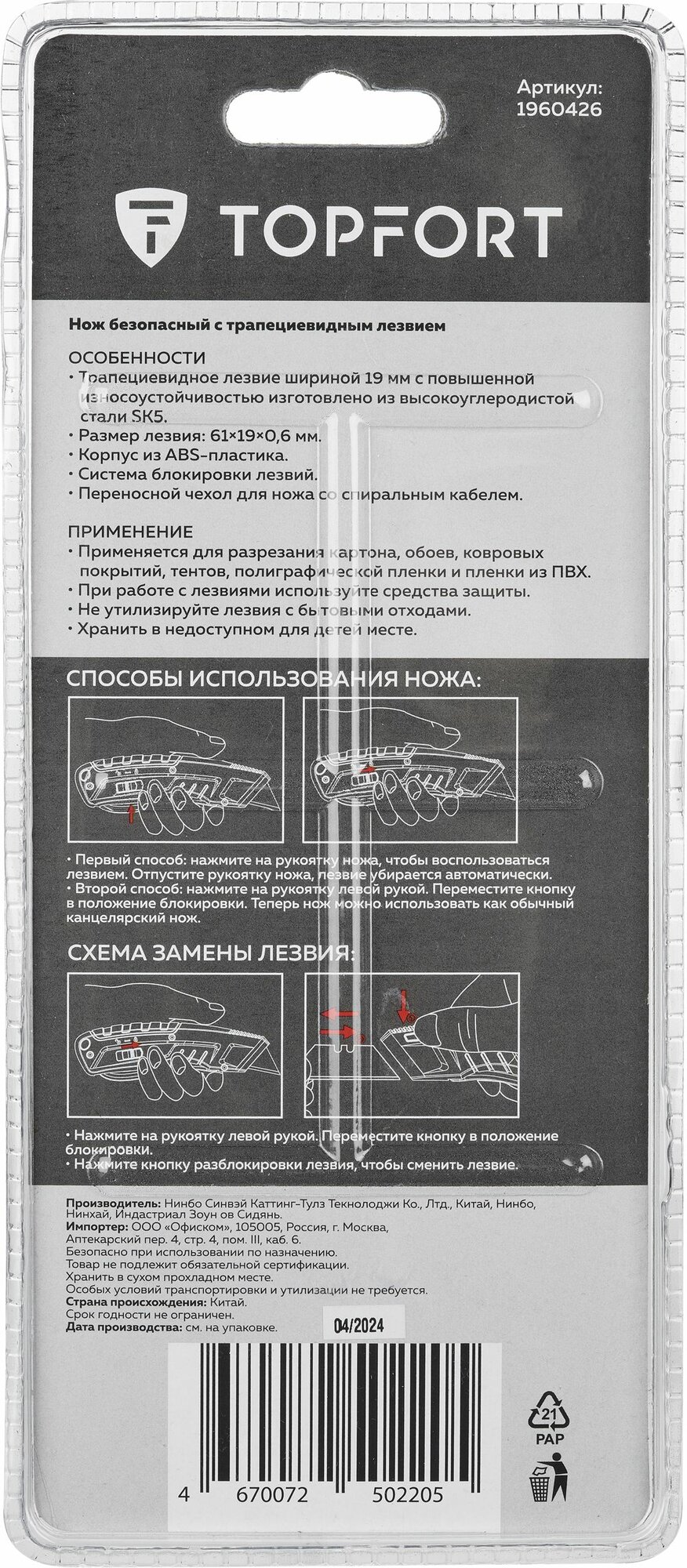 Нож безопасный, TOPFORT, с кобурой, ширина лезвия 19 мм, с фиксатором интересное: