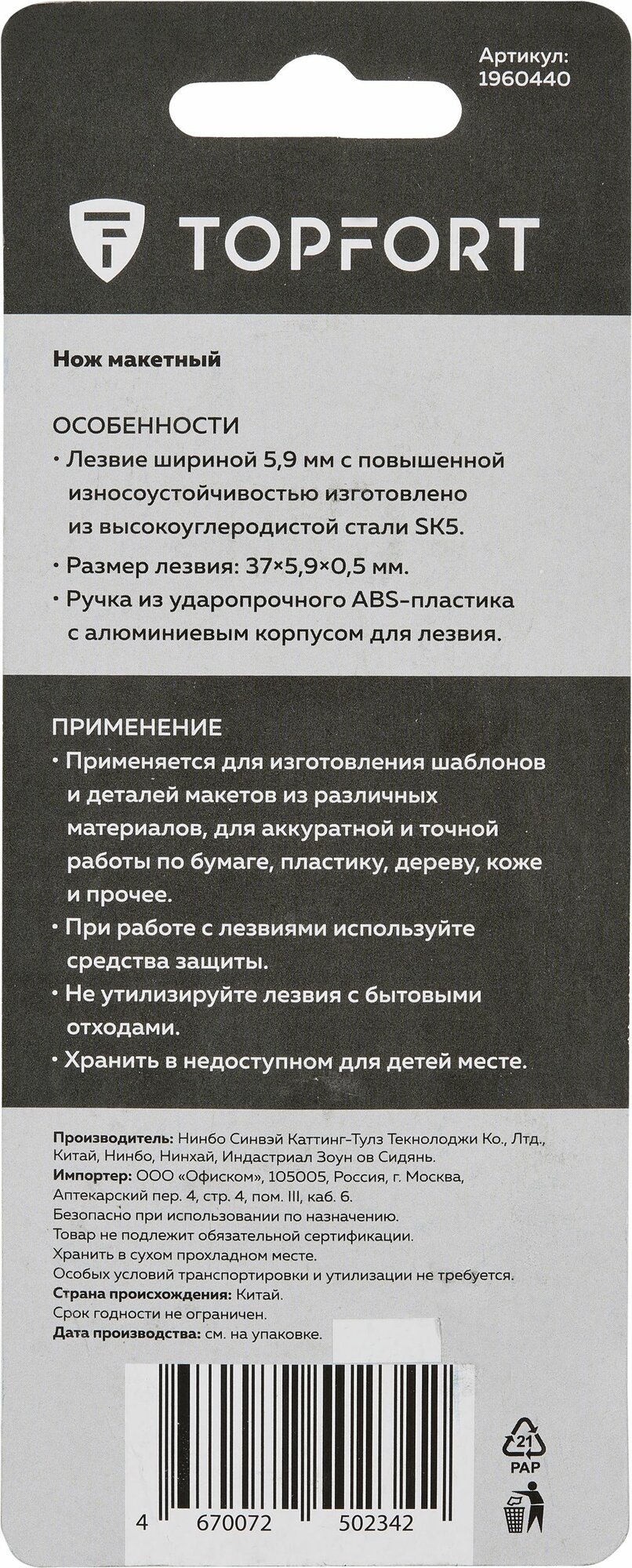 Нож скальпель, мини, TOPFORT, макетный, ширина лезвия 5,9 мм интересное: