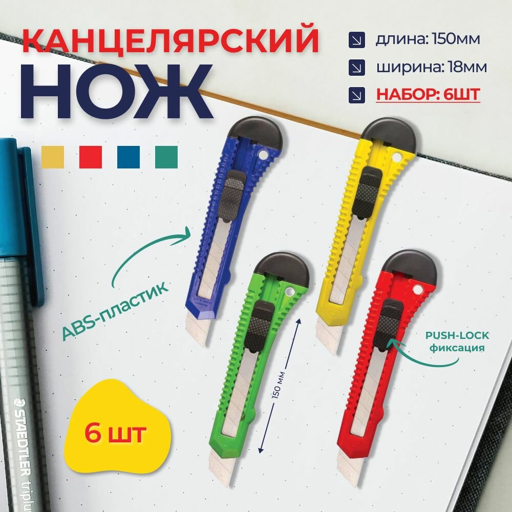 Нож канцелярский 18 мм, набор 6 штук, пластик, с фиксатором лезвия интересное: