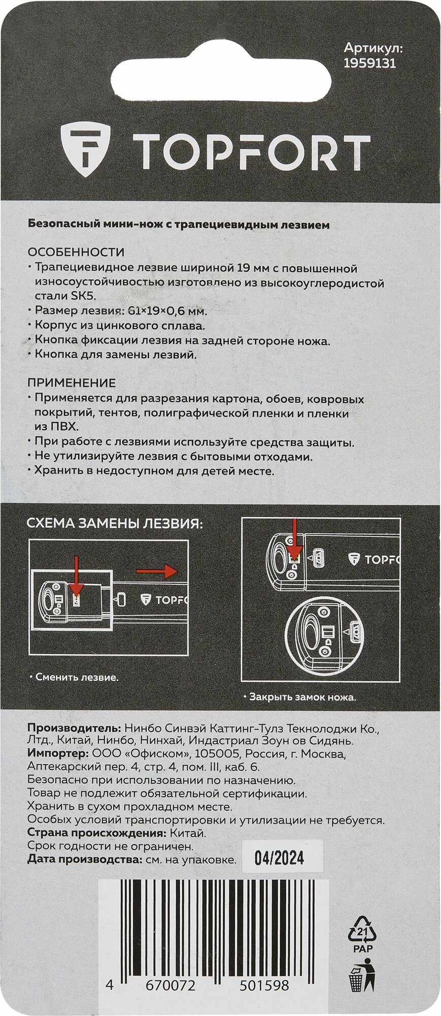 Нож безопасный, TOPFORT, мини, ширина лезвия 19 мм, с фиксатором интересное: