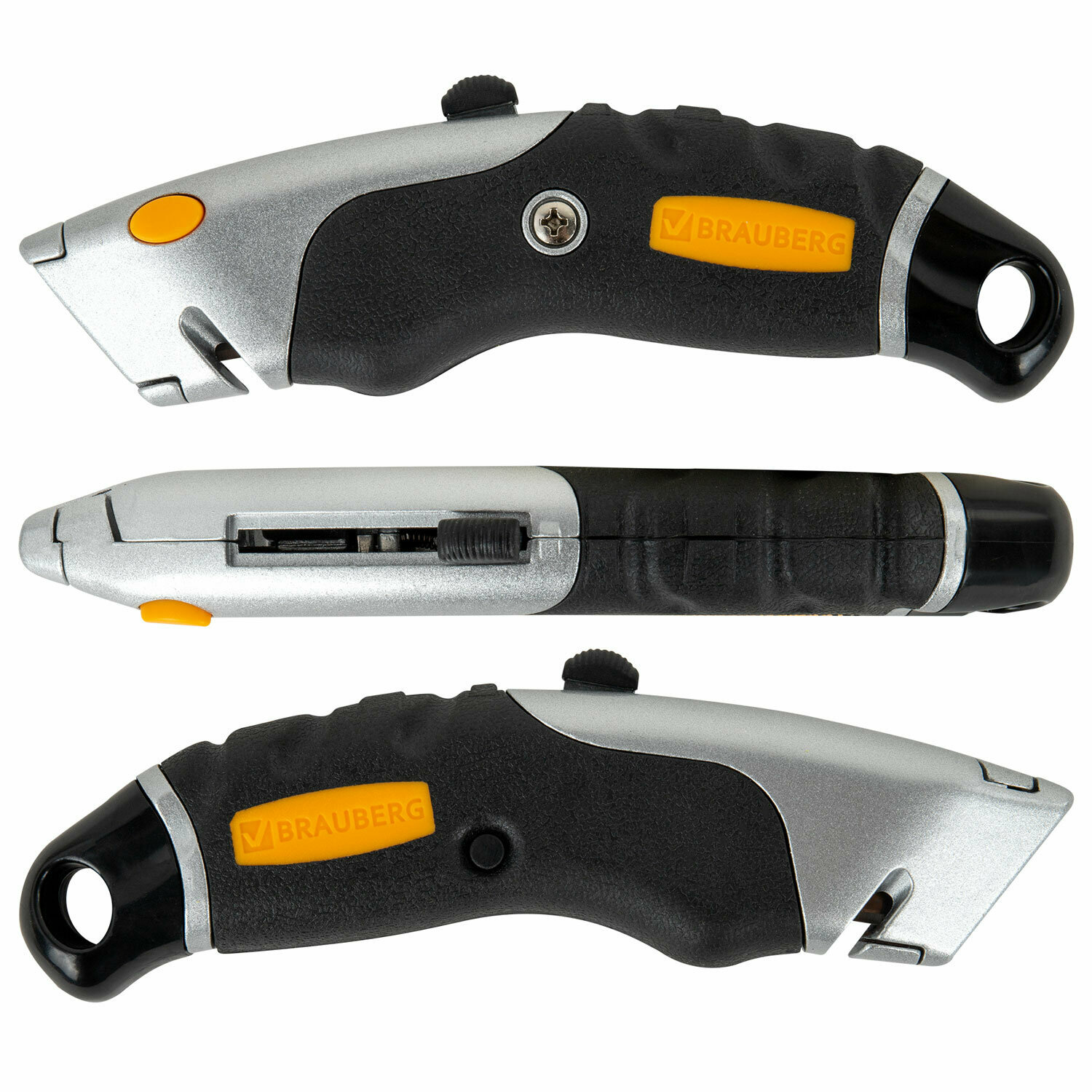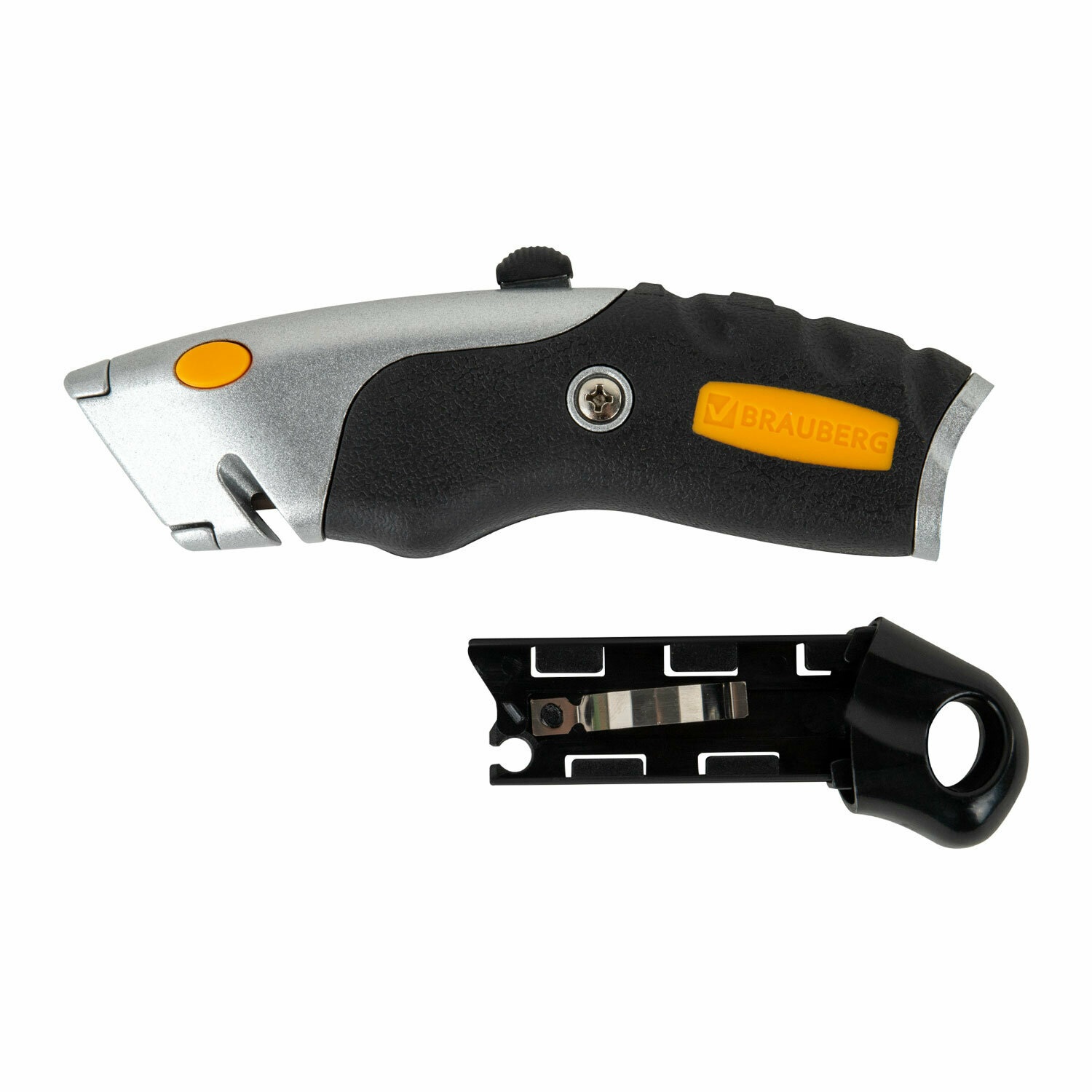 Нож канцелярский строительный универсальный мощный, ширина лезвия 18 мм, автофиксатор, функция автовозврата, Brauberg Metallic Pro, 238737