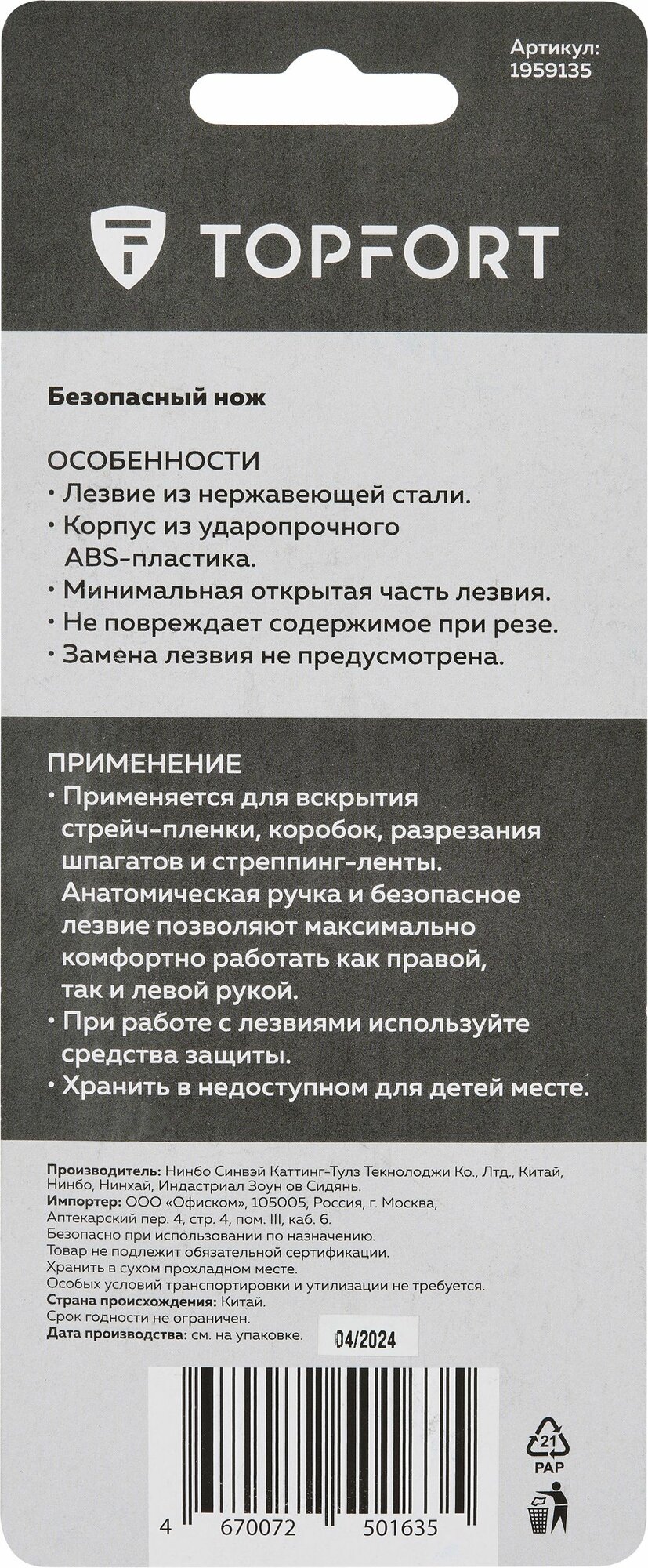Нож безопасный, TOPFORT, с фиксированным лезвием для вскрытия упаковки интересное: