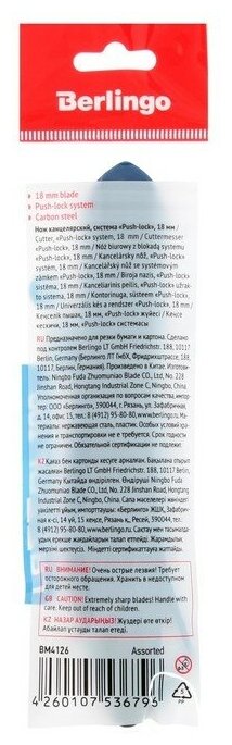 Купить Нож канцелярский 18мм Berlingo "Razzor 100", push-lock, ассорти, европодвес 316184