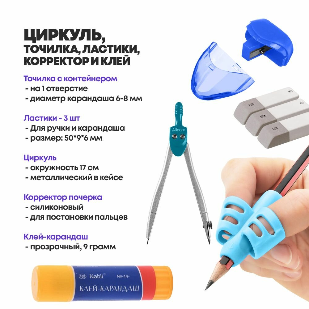 Набор первоклассника 107 предметов, 35 наименований, канцелярские школьные принадлежности для мальчика в 1 класс