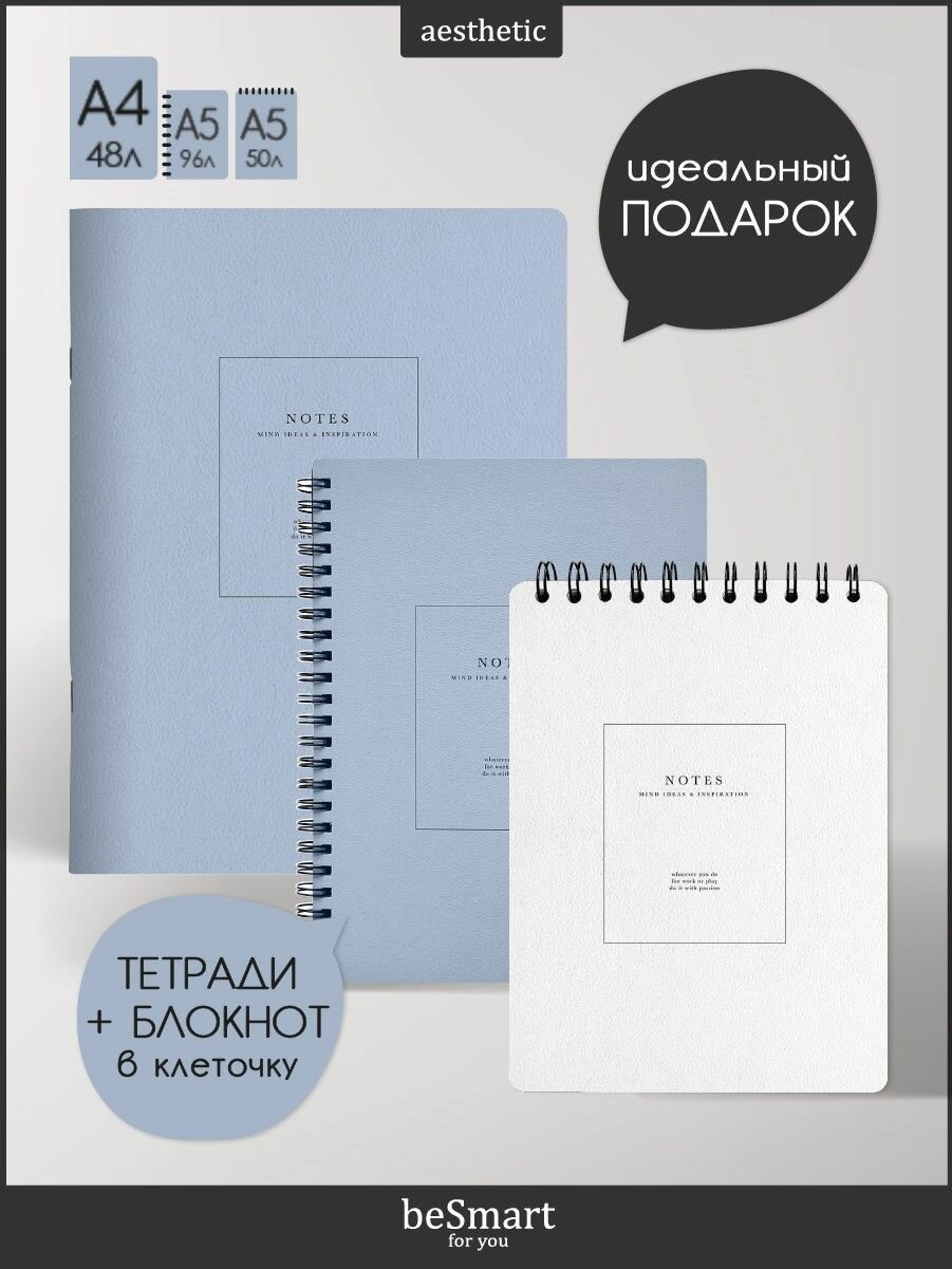 Подарочный канцелярский набор Be Smart №7: тетради А5 и А4 на скрепке на 40л в клетку, блокнот 9х17 на спирали на 100л