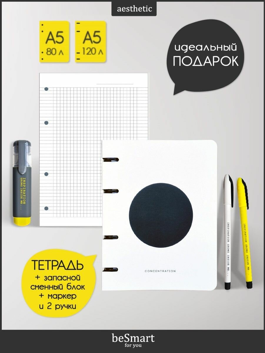 Купить Подарочный канцелярский набор Be Smart №7: тетрадь А5 на кольцах на 120л, сменный блок А5 на 80л, ручка шариковая, 2шт, маркер