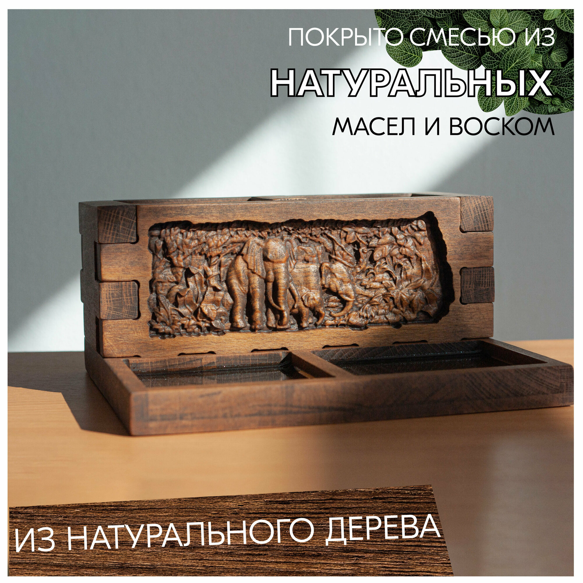 Органайзер для канцелярии настольный деревянный Слоны подарочный, с натуральной кожей