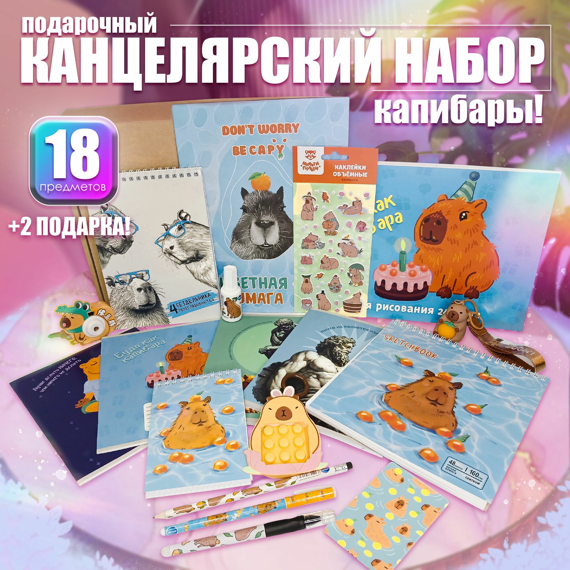 Купить Набор канцелярии "капибарности! Надобности!" 18+2 предметов, бокс письменных принадлежностей в подарочной коробке А4, канцелярский набор для школы (капибара)
