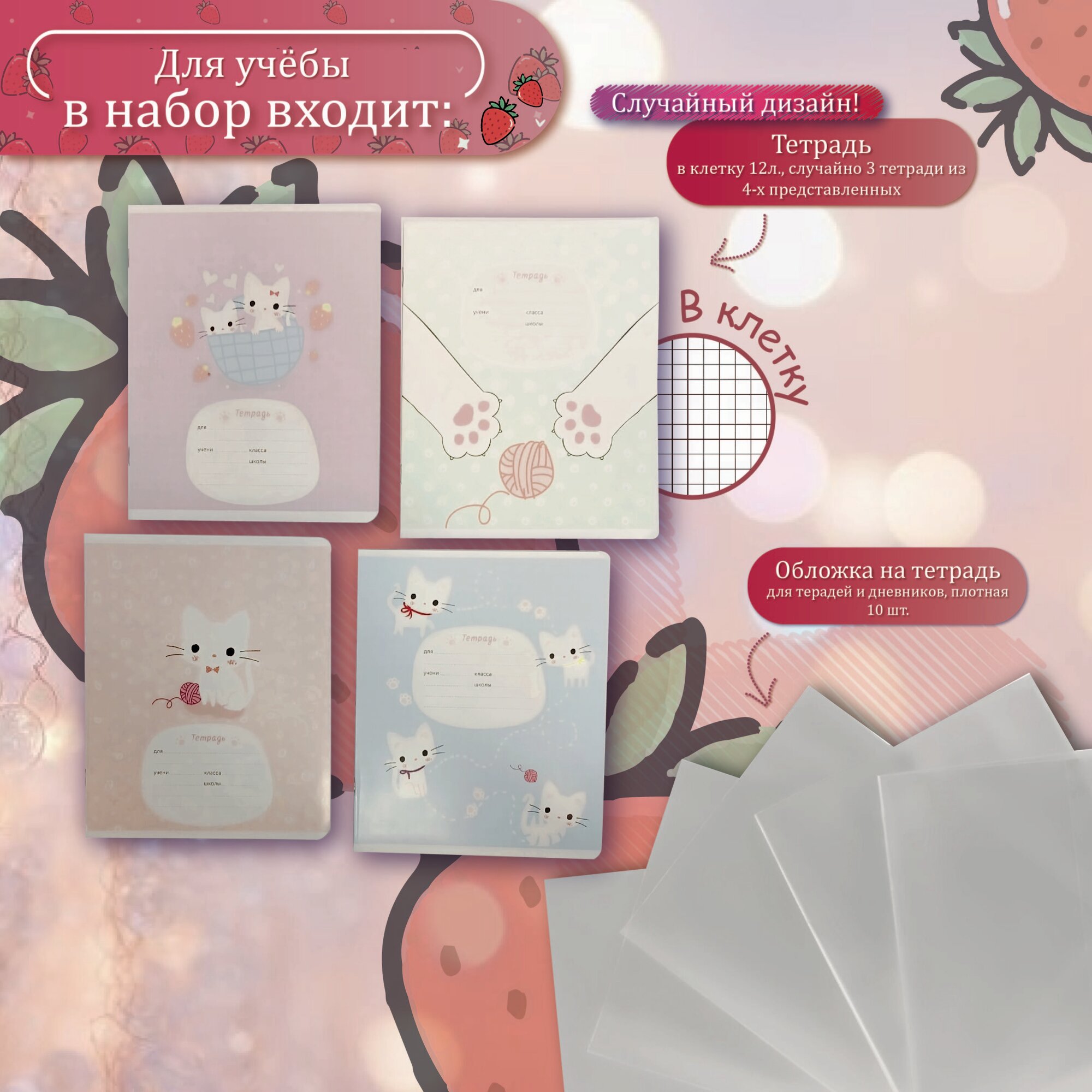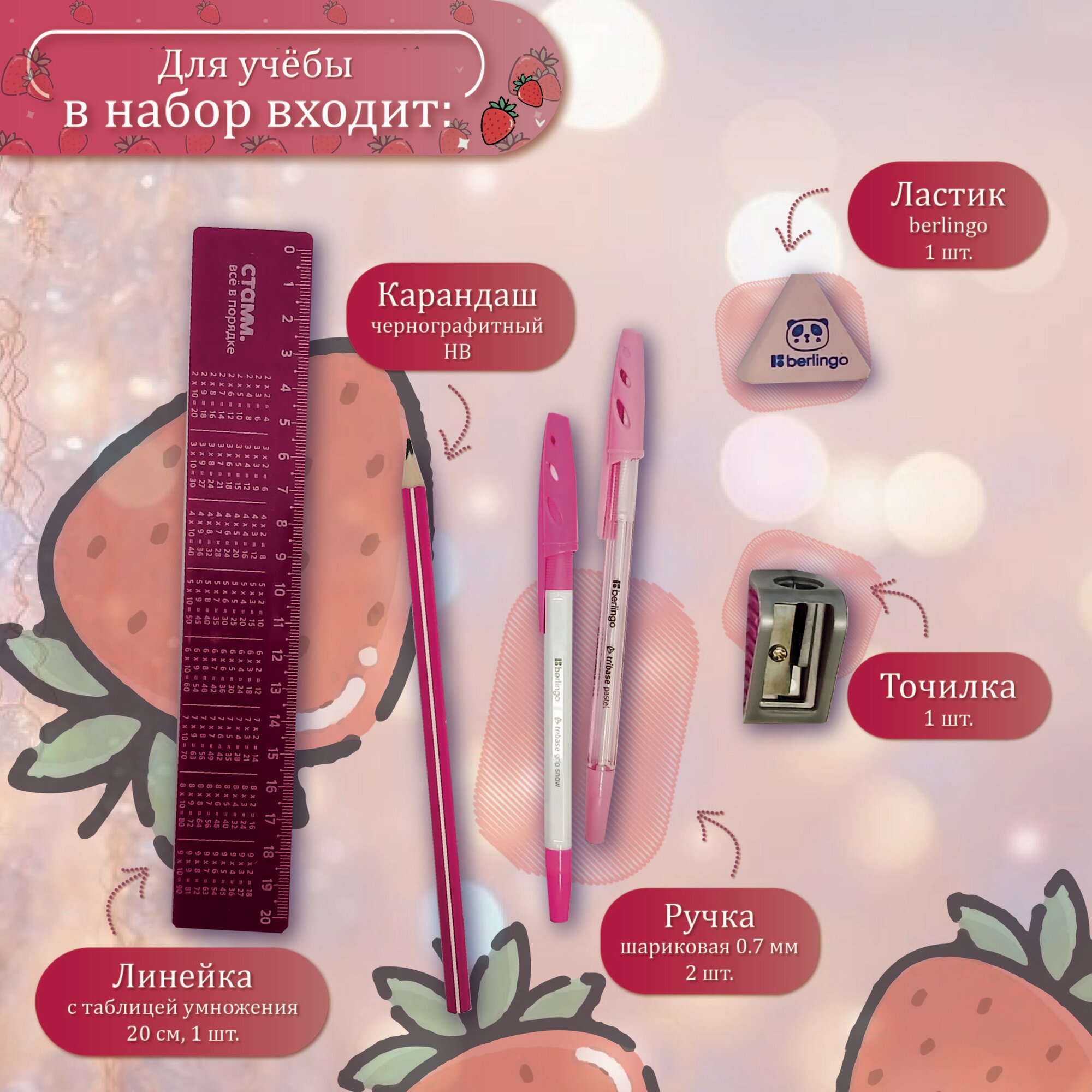 Набор для начальной школы, для девочки 26 предметов "Котенок в клубнике" в папке, набор школьных канцелярских принадлежностей интересное: