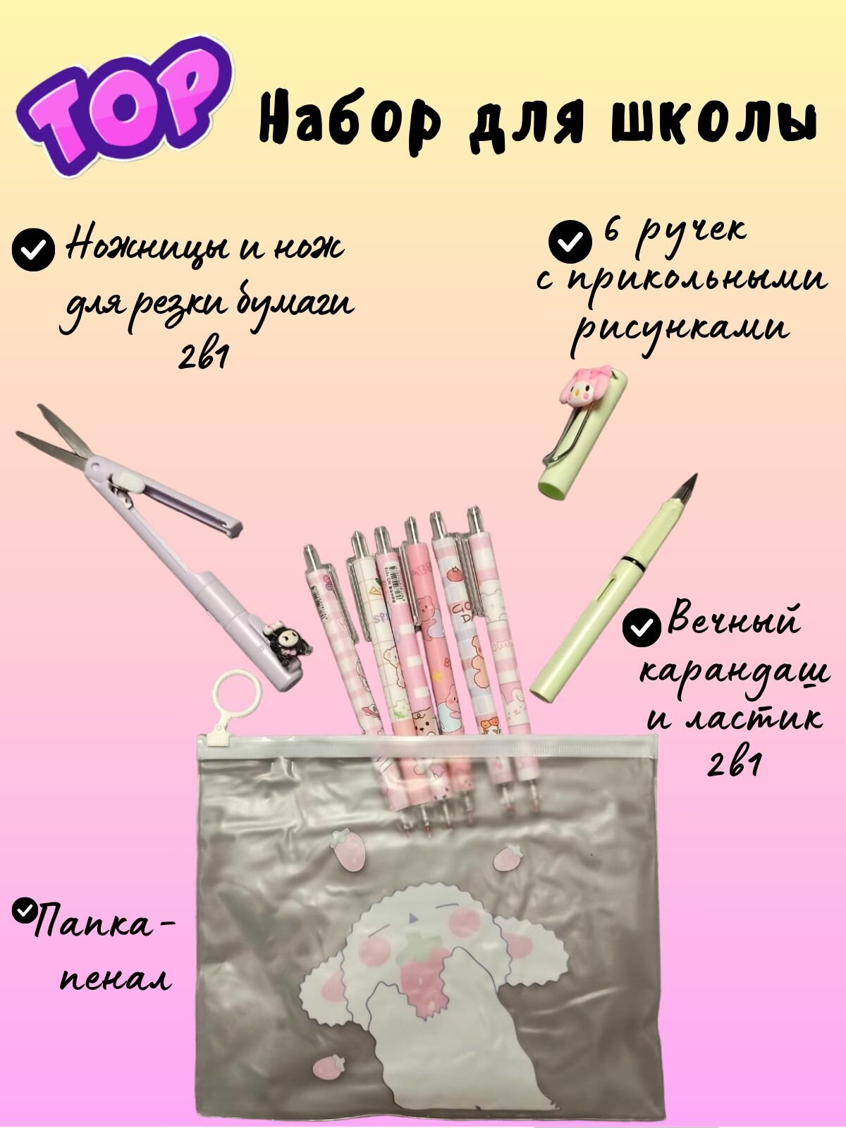 | В комплекте | карандаш, ластик, ножницы, пенал, ручка, Канцелярский нож |