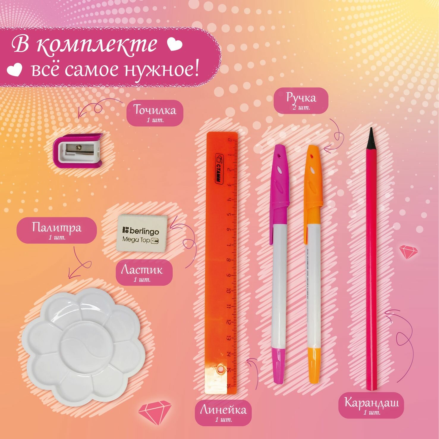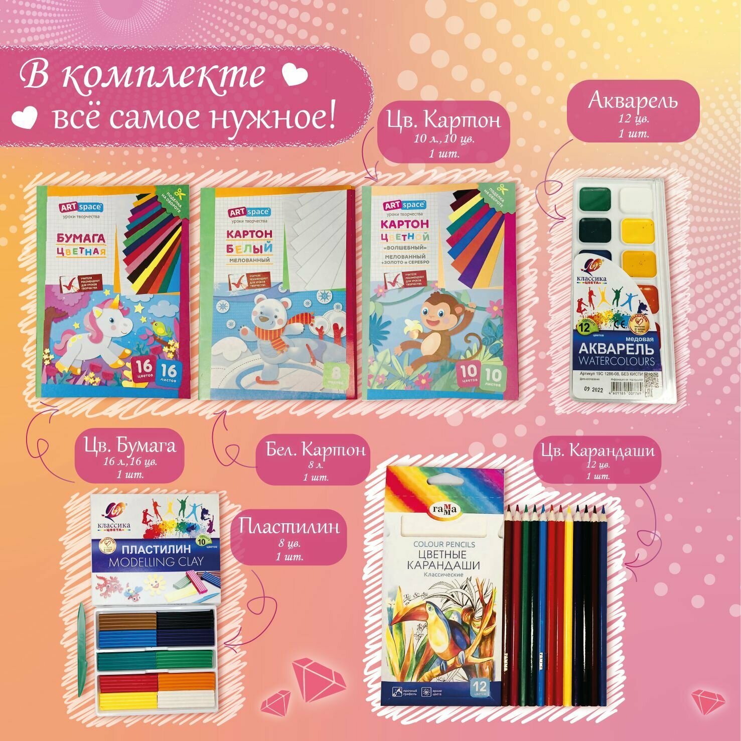 | В наборе | альбом для рисования / карандаш / краски / ластик / линейка / палитра / папка пластиковая / пластилин / ручка / тетрадь / точилка / цветная бумага / цветной картон / цветные карандаши |